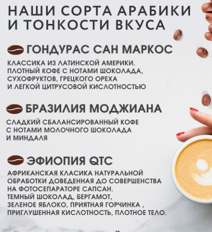 Описание: Говорят, что кофе и хороший кофе – это два разных напитка. Мы добавим от себя, что есть еще и великолепный кофе с насыщенным ароматом и роскошным, поистине королевским вкусом. Бренд "Quintessence Coffee" предлагает Вашему вниманию натуральный кофе в зернах свежей обжарки, который доставляется напрямую из Эфиопии, из региона Моджиана (Бразилия), Вьетнама, Никарагуа и муниципалитета Сан-Маркос в западном Гондурасе. - Кофе в зернах "Гондурас Сан-Маркос", 100% арабика, 1 кг. – несомненная классика из Латинской Америки. Плотная структура кофе оттенена нотками горького шоколада, сухофруктов, грецкого ореха и легкой цитрусовой кислинкой. Идеально подойдет для классической заварки и эспрессо. - Зерновой кофе "Бразилия Моджиана", 1 кг. (100% Arabica) – более нежный, чем другие виды. Его сладкий сбалансированный вкус дополнен нотами молочного шоколада и миндаля, и станет замечательным выбором любителям капучино и латте. - "Эфиопия Сидамо", 1 кг. (зерно 100% высокогорная Арабика) – Африканская классика с плотной структурой натуральной обработки, доведенная до совершенства на фотосепараторе "Сапсан". Насыщенный вкус с приятной горчинкой оттенен нотками темного шоколада, бергамота и зеленого яблока. - Кофе в зернах арабика 100%, 1 кг., "Никарагуа Ройял" – роскошный латиноамериканец с плотной структурой и насыщенным послевкусием апельсина, тоста, ореха и карамели. Идеален для эспрессо и американо. - Вьетнам Далат, 1 кг, 100% Арабика - Мягкий кофе с шоколадным профилем, хорошей сладостью и легкой нотой апельсиновой цедры на послевкусии. Каждый из перечисленных сортов кофе обжарен и расфасован на современном оборудовании, которое не позволит попасть в упаковку ни одному дефекту или некачественному зернышку робусты. Доставляется в специальных фольгированных зип-пакетах для удобного хранения и станет замечательным подарком или сувениром истинному ценителю кофейной паузы. Важным будет отметить: наш зерновой кофе обжарен под строгим контролем и благодаря авторской обжарке идеально подойдет не только для кофемашины, но и для френч-пресса, фильтра, турки, или кофеварки после выбранного Вами помола. Обратите внимание, что для получения идеального именно для Вас вкуса, важно не только молоть натуральный кофе сразу перед приготовлением, но и правильно регулировать помол: мелкий помол дает более насыщенный вкус, средний или крупный помол – тонкий, с легкой кислинкой. С уважением и надеждой на скорую встречу, Ваш Quintessence Coffee.