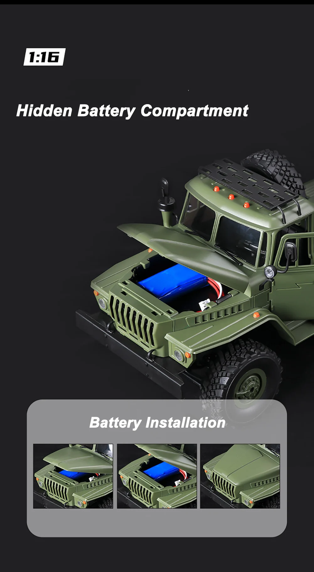 -Высокая симуляция: имитация внешнего вида и конструкции грузовика, резиновые шины, открывающиеся и закрывающиеся автомобильные двери, яркие двойные фары делают его похожим на настоящий армейский грузовик.