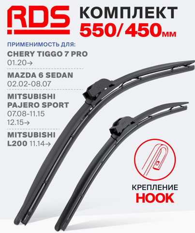 Описание: Популярная торговая марка щеток стеклоочистителя RD5. Нашу продукцию выбирают многие автолюбители, об этом говорят множество положительных отзывов! Высокое качество продукции в сочетании с не большой ценой делает наш товар отличным выбором! Конструкция щеток стеклоочистителя RD5 обладает высокой надежностью и устойчивостью. Материал резинок стеклоочистителя произведен из высококачественного сырья и имеет двойное графитовое покрытие, что делает работу дворников бесшумной и комфортной! Мы уверены в нашей продукции на 100%. Комплект бескаркасных модифицированных щеток 550 450 мм. Крепление hook (Крючок). Применимость: Chery Tiggo 7 Pro 01.20-, Черри Тигго 7 Про; Mazda 6 Sedan GG/GY 02.02-08.07, Мазда 6; Mitsubishi Pajero Sport KH 07.08-11.15, Митсубиши Паджеро Спорт; Mitsubishi Pajero Sport KS 12.15-, Митсубиши Паджеро Спорт; Mitsubishi L200 KJ 11.14-, Митсубиши Л200.