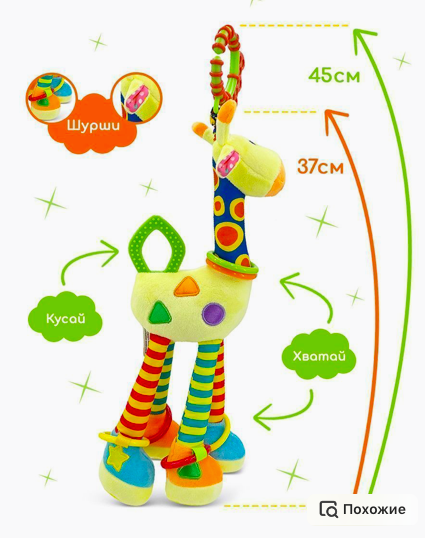 Описание: Где бы вы не были: дома, на свежем воздухе или в путешествии, веселый жираф не даст скучать вашему малышу! Используя подвеску, можно прикрепить жирафика к спинке кроватки или к ручке автокресла, а можно подвесить над коляской. Игрушка стимулирует развитие всех органов чувств малыша: яркие цвета улучшают зрительное воспритие, шуршащие ушки и встроенная пищалка - слуховое, разнофактурные материалы - тактильное. Прорезыватели можно грызть, чтобы тренировать маленькие зубки. Игрушка изготовлена из сертифицированных материалов и рекомендована детям с рождения.