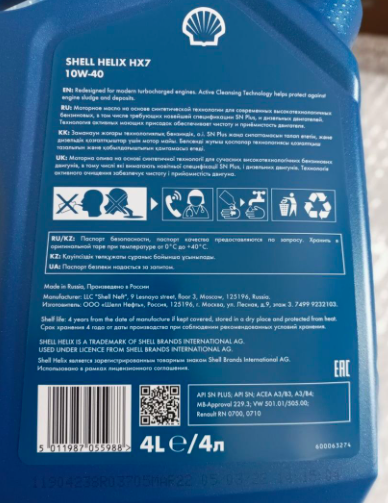 Описание: Моторное масло Shell Helix hx7 10w-40 создано на основе синтетических и минеральных компонентов. Такой состав масла Shell Helix hx7 10w 40 позволяет улучшить работу двигателя и защитить его от износа. Масло моторное Шелл Хеликс 10в40 подходит для двигателей, работающих на основе бензина, газа и дизельного топлива. Shell 10w-40 также превосходно сочетается с продуктами, имеющими в своем составе этанол и жирные кислоты. Классификация Shell Helix hx7 10w40 по API: SN, SN PLUS, CFКлассификация по ACEA: A3, B3, B4 Допуски и одобрения: [Fiat 9.55535-G2], JASO SG+, MB-Approval 229.3, Renault RN0700, Renault RN0710, VW 502.00, VW 505.00.
