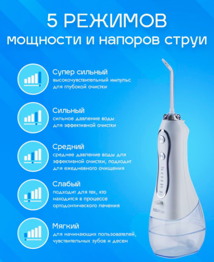 Описание: Ирригатор для ротовой полости избавит вас от налёта, зубного камня и других проблем. Бытовая техника вернёт здоровье зубам, придаст им красоты и обезопасит от походов к стоматологу. Ирригатор оснащен 8 насадками, которые помогут полностью очистить ротовую полость. В комплекте есть стандартная насадка для ежедневного ухода, а также ультра версия, помогающая убирать зубной налёт и камень. Они смогут вернуть здоровье и красоту зубов даже в запущенном состоянии. Ирригатор выдаёт при работе до 1800 импульсов в минуту, за счёт японской водяной помпы, обеспечивая максимально качественную очистку. Благодаря аккумулятору вы сможете следить за красотой и здоровьем лица на протяжении 4 часов без подзарядки. Бака на 300 мл достаточно для 2 и более обработок ротовой полости при максимальном давлении. Специальные насадки помогут избавится от налёта на языке. На ирригатор действует гарантия 12 месяцев. Вы всегда можете обратится в нашу службу поддержку за советом или вопросам. Желаем вам приятных покупок