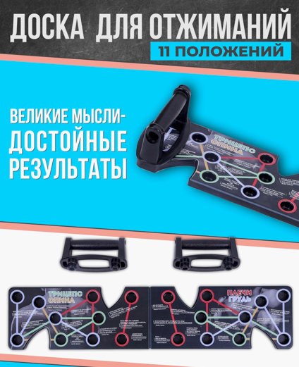 Описание: Спортивный снаряд спортивная доска с упорами для отжиманий, размеченная по специальной системе упражнений на различные группы мышц и зон торса - плечи, спину, руки, грудь. Этот спортивный снаряд доска для отжиманий выдерживает интенсивные ежедневные нагрузки и создана для регулярных упражнений, выдерживает до 150 кг. Разборная конструкция спортивного товара позволяет брать его с собой. Отличный спортивный инвентарь для ежедневных тренировок! Это компактный тренажер для отжиманий - отличный подарок мужчине, подарок на День рождение, подарок ко Дню рождения!