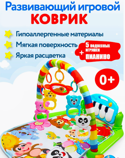 Описание: Развивающий игровой коврик с пианино разработан для стимулирования сенсорных, когнитивных и физических навыков детей. Малыш откроет для себя невероятный мир полный новых ощущений, сочных красок, ярких образов и звуков.**4 способа игры в зависимости от возраста:**- Для самых маленьких - лежа на спине. Малыш может нажимать на клавиши пианино и играть с подвесными игрушками, которые крепятся на дуге;- Лежа на животе - ползать, заниматься игрушками, рассматривать себя в безопасное зеркало;- Сидя на коврике - дуга снимается, а положение пианино меняется из вертикального в горизонтальное;- Подросший малыш может всегда взять съемное пианино с собой, например на прогулку.Яркие игрушки надолго привлекут внимание Вашего малыша. Все элементы изготовлены из безопасных для здоровья детей материалов. Уход: Мягкие части коврика можно стирать в машине (бережная стирка) и сушить на воздухе. Пластиковые части - протирать влажной тканью. Пианино работает на батарейках АА (в комплект не входят).