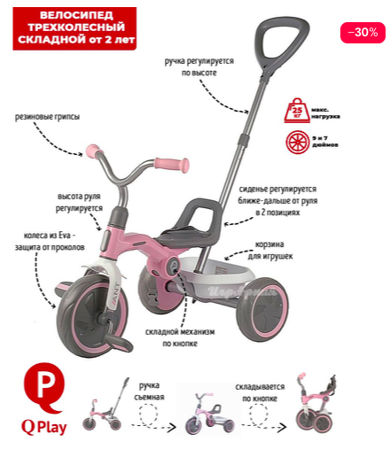 Описание: Бренд Q-Play Количество колес 3 Вес в собранном состоянии, кг 4.5