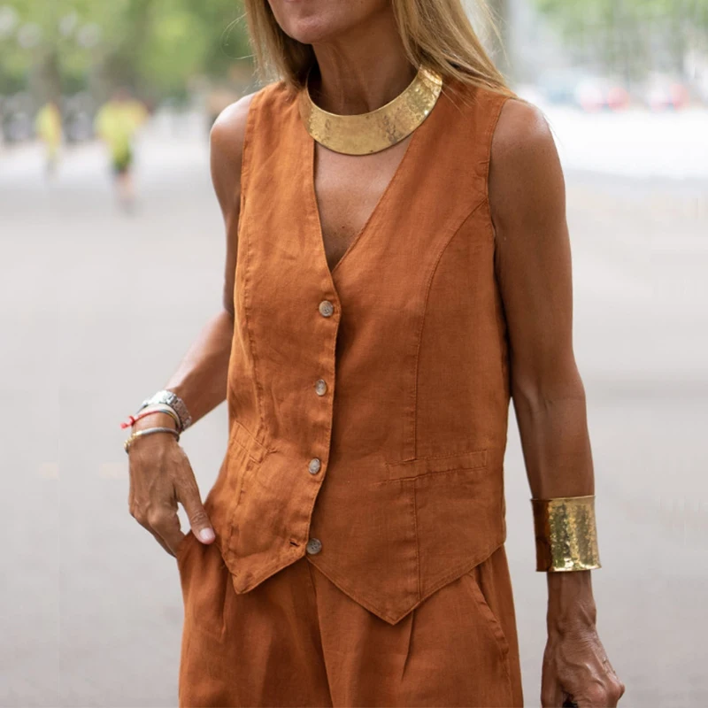 Женский винтажный однобортный жилет без рукавов, свободный однотонный топ из хлопка и льна с V-образным вырезом и вырезами, летний сезон