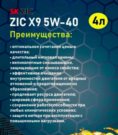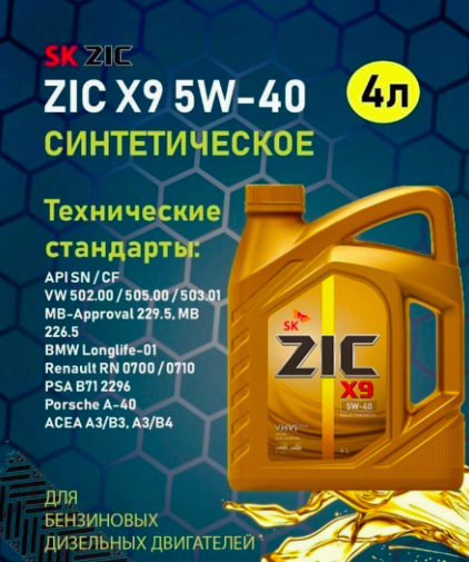 Описание: Полностью синтетическое моторное масло для бензиновых и дизельных двигателей легковых автомобилей. Выполняет требования API SP: дополнительная защита от LSPI, защита от износа цепи ГРМ, улучшенная топливная экономичность. Масло произведено с использованием собственного синтетического базового масла YUBASE PLUS и современного сбалансированного пакета присадок. Вязкость : 5в40, 5в 40, 5в-40, 5в--40, 5w40, 5w 40, 5w--40. РЕКОМЕНДАЦИИ И СПЕЦИФИКАЦИИ: API SP ACEA A3/B4 Volkswagen, Audi, Skoda 502.00 / 505.00 / 503.01 MB-Approval 229.5, MB 226.5 BMW Longlife-01 Renault-Nissan RN 0700 / 0710 PSA B71 2296 Porsche A-40. ПРЕИМУЩЕСТВА: Эффективно работает в широком диапазоне температур. Хорошая низкотемпературная текучесть масла обеспечивает легкий запуск двигателя и защиту от износа при низких температурах (для SAE 5W-40). **ZIC X9 SAE 5W-40 API SN/CF** ZIC Моторное масло X9 5W-40 синтетическое 4л / 162613 для бензиновых и дизельных двигателей 162902 Кроме того, на таких канистрах мы используем классическую крышку с резьбой и стопорным кольцом. Крышка снимается, а стопорное кольцо остается на месте. Под крышкой находится загулшка из фоьги, впаянной в горлышко канистры. На фольгу нанесены логотипы SK ZIC. Каждая крышка покрывается термоусадочной пленкой с логотипом SK. Подобную пленку, кстати, кроме нас никто не использует. Кроме того, сама канистра имеет сложную поверхность, покрытую выпуклостями и вкраплениями. Пластик, из которого изготовлена канистра - плотный и непрозрачный. На лицевую этикетку каждой из канистр наносится номер партии масла и дата производства, указанная по американско-корейским правилам — сначала пишется год, потом месяц и дата.