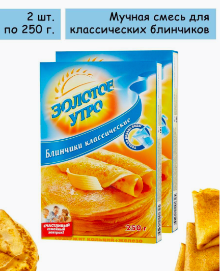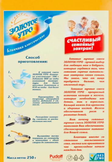 Описание: Готовые мучные смеси Пудовъ "Золотое утро" - лучший выбор для любящих мам и бабушек, которые гордятся тем, что готовят горячие питательные завтраки своим семьям.Готовые мучные смеси Пудовъ "Золотое утро" - прекрасный источник кальция и железа, которые необходимы как детям, так и взрослым. Кальций важен для крепости и здоровья костей. Железо обеспечивает рост и развитие детей. Вот почему готовые мучные смеси Пудовъ "Золотое утро" помогают вам обеспечивать сбалансированное питание для вашей семьи.Блинчики вместе со стаканом апельсинового сока, молока или ароматного чая - превосходное начало каждого дня.