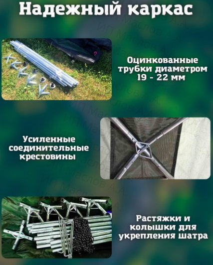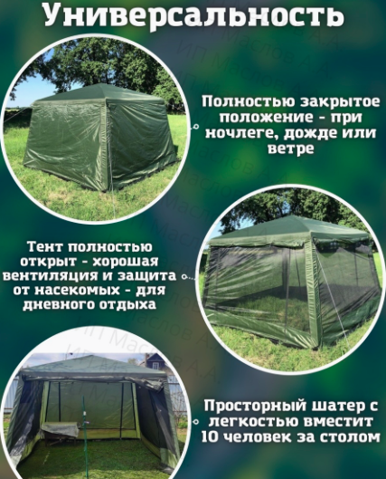 Описание: **Просторный** **туристический шатер** с **ветрозащитной юбкой** и усиленным **металлическим каркасом**цвета хаки. **Походная кухня с москитной сеткой** и **опускающимися пологами**. Особенности **шатра: водонепроницаемый материал** **тента**Poly Taffeta 190T PU, Оxford 150D, все швы проклеены, **москитная сетка** по периметру, высокая центральная часть (2.45 м), что позволит повесить внутри **фонарь**, который никто не будет задевать головой.