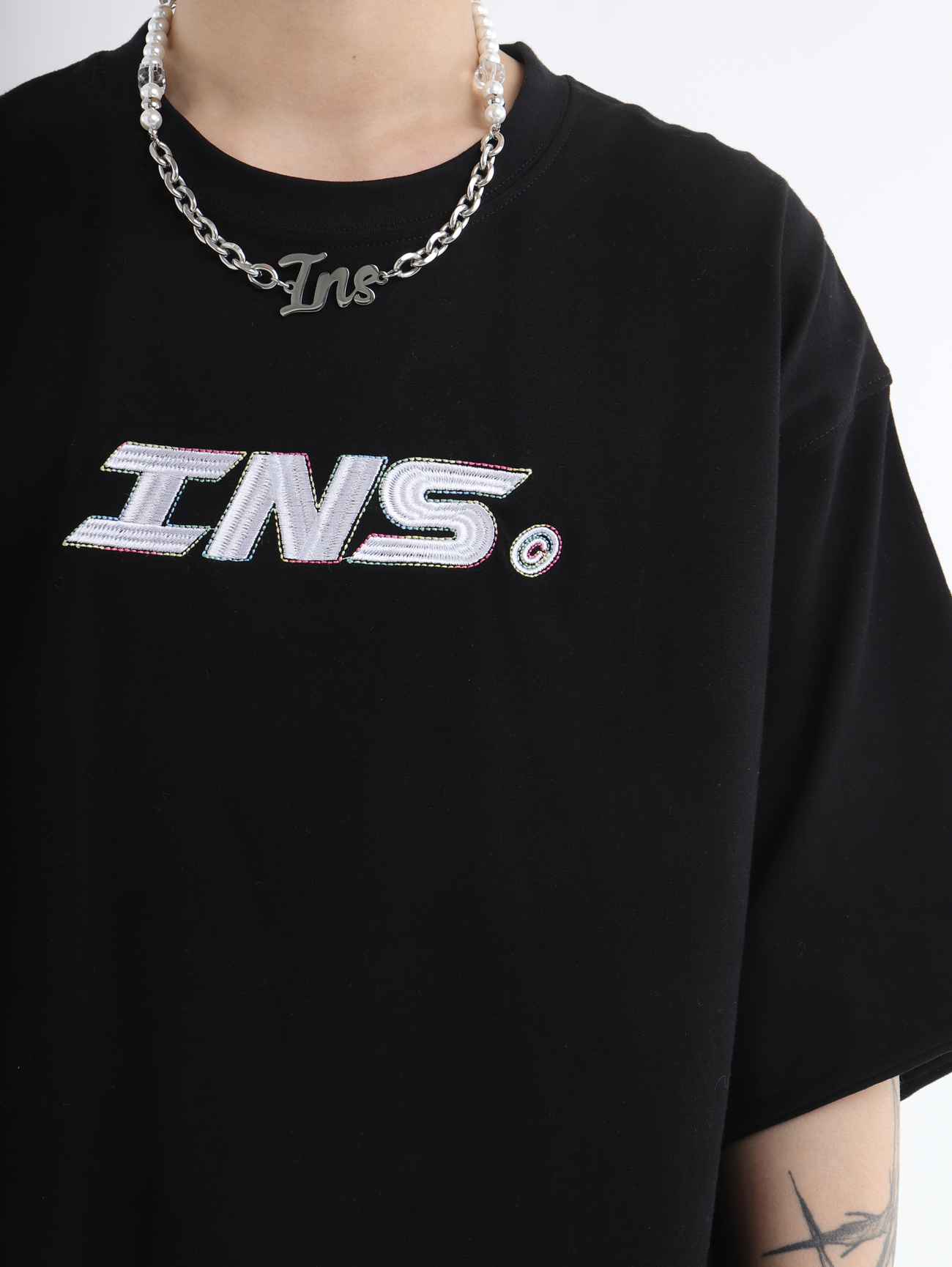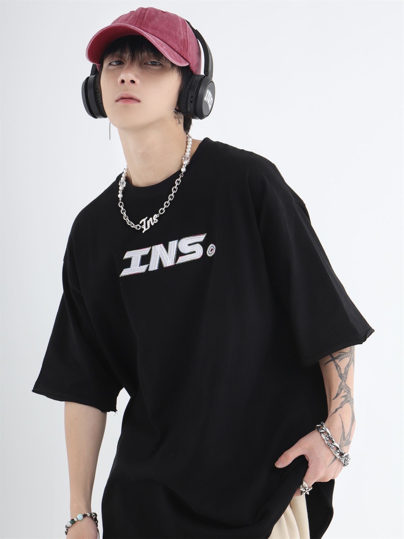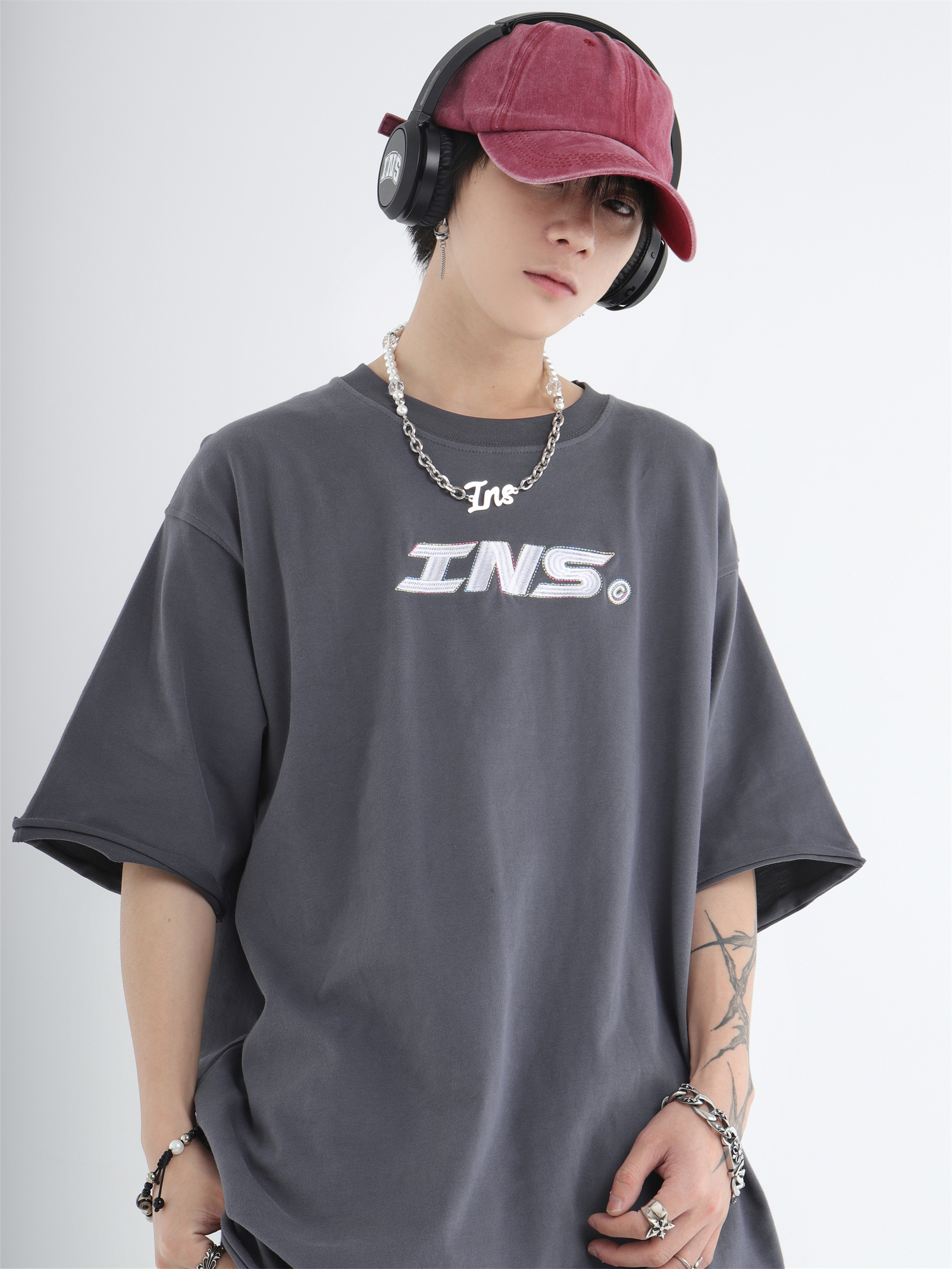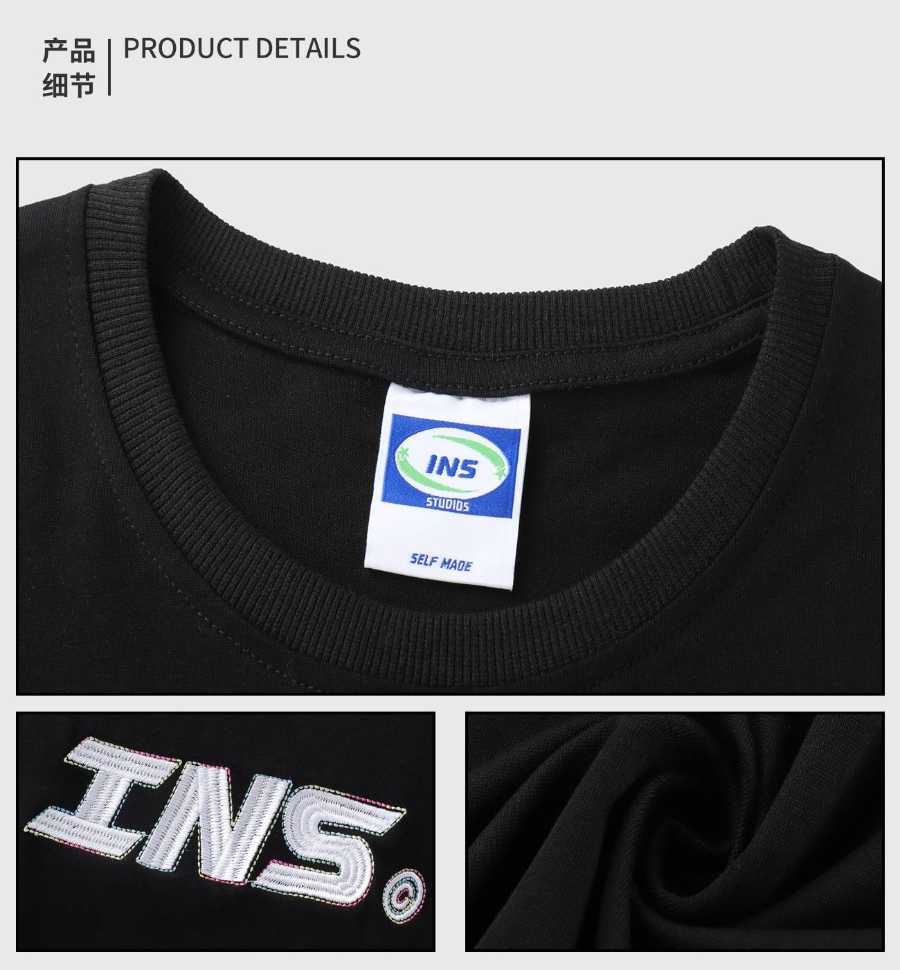 INSstudios 彩線小LOGO刺繡短袖國潮情侶街頭復古百搭捲邊純棉T恤
