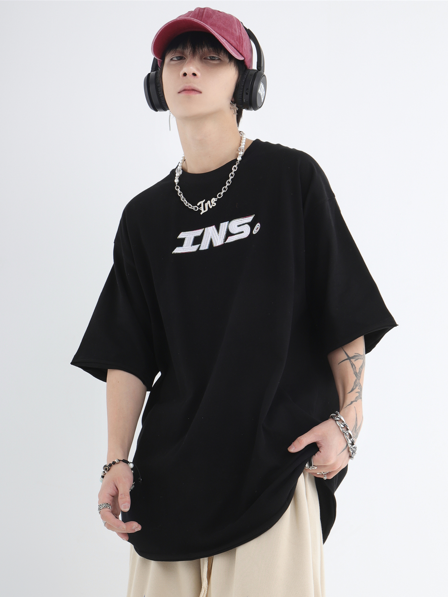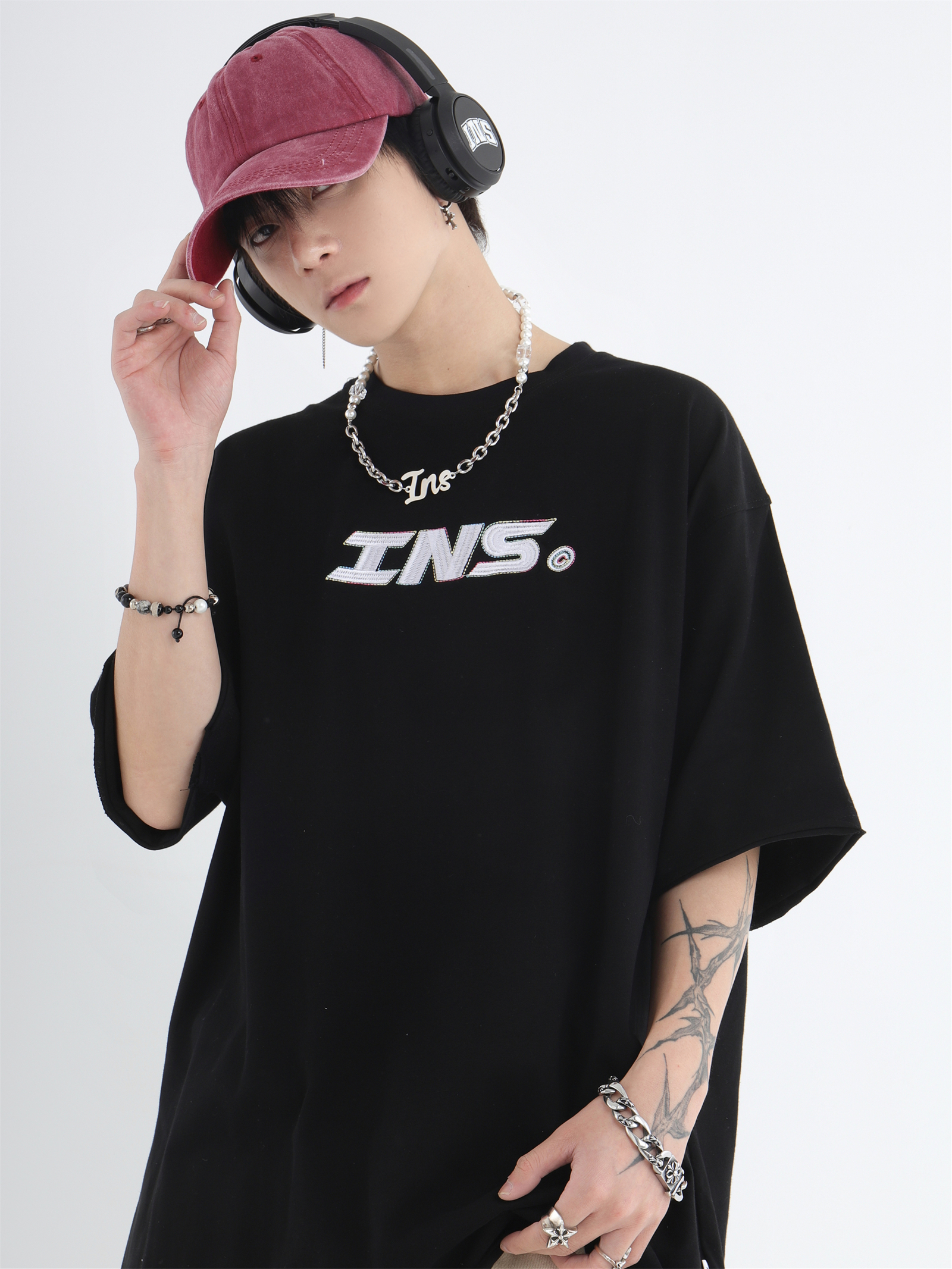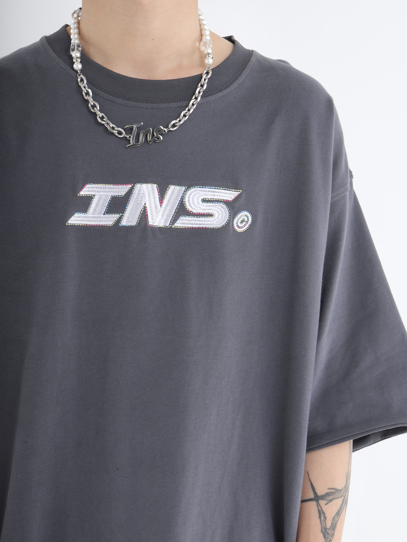 INSstudios 彩線小LOGO刺繡短袖國潮情侶街頭復古百搭捲邊純棉T恤