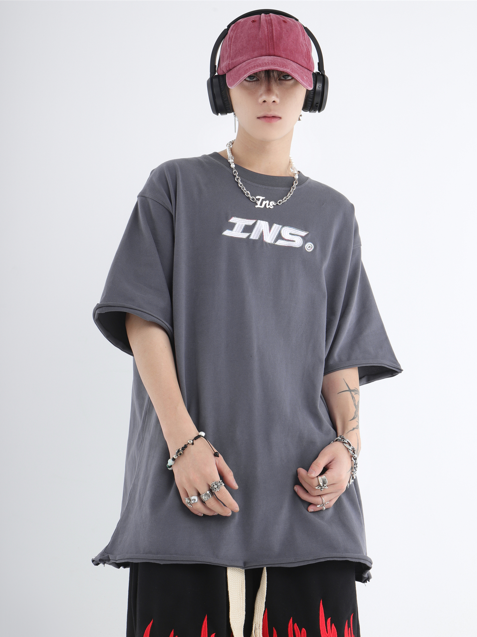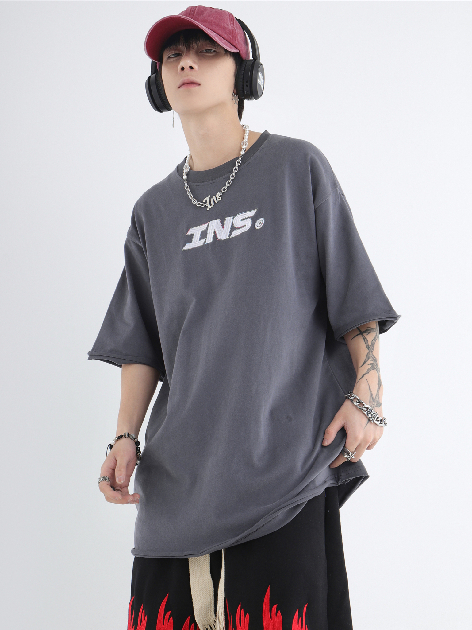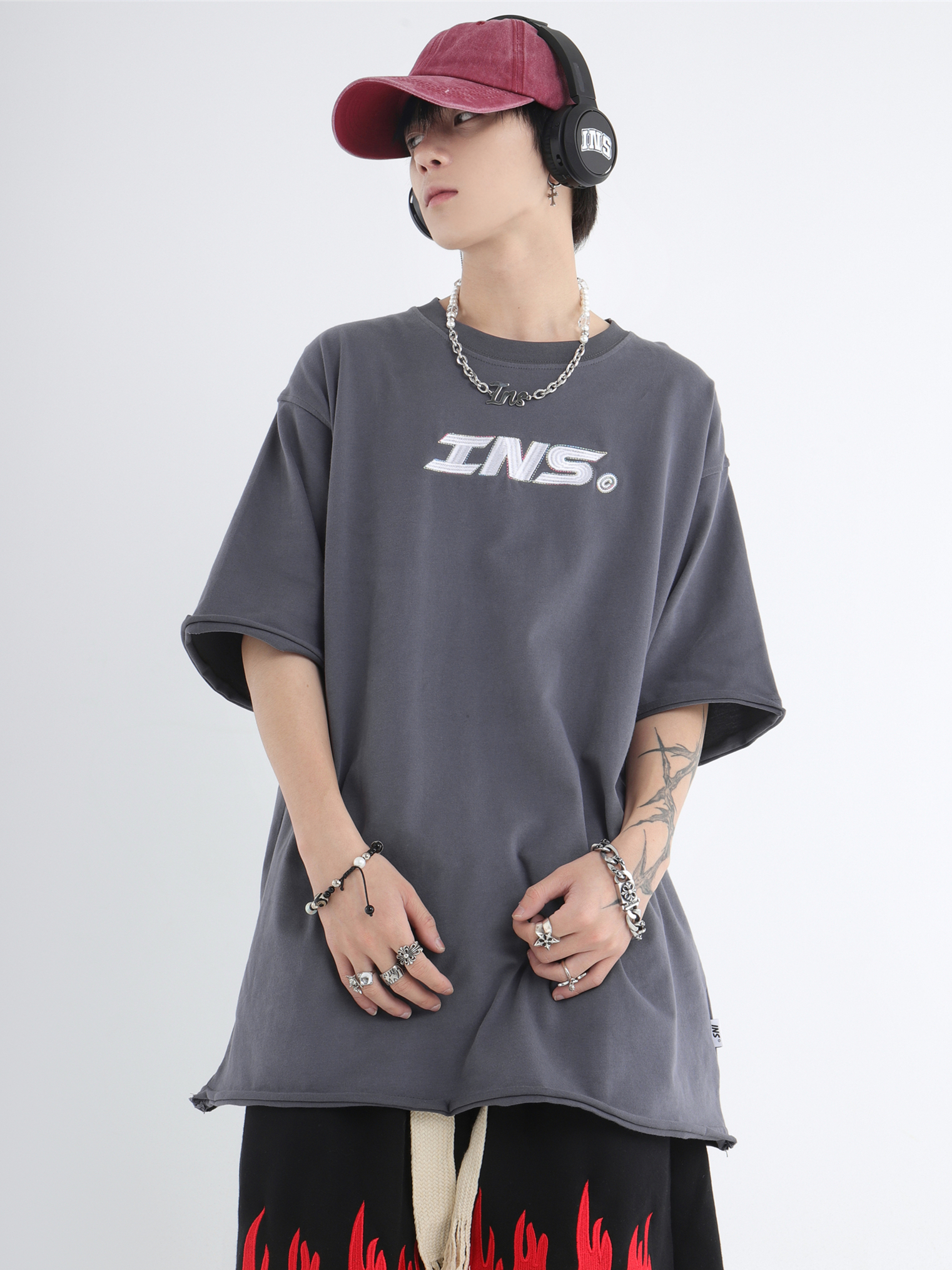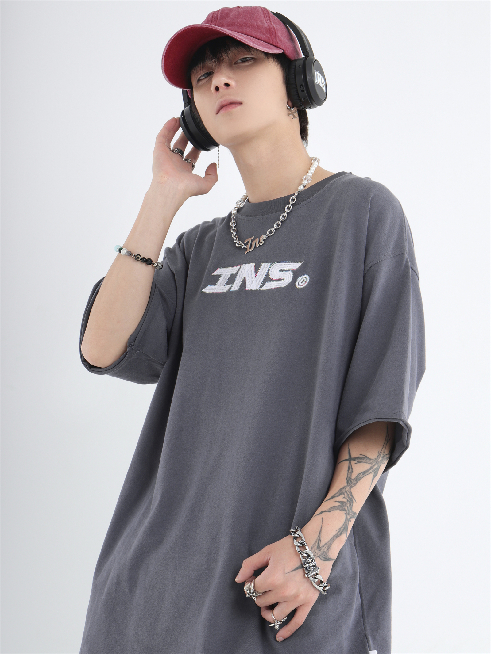 INSstudios 彩線小LOGO刺繡短袖國潮情侶街頭復古百搭捲邊純棉T恤
