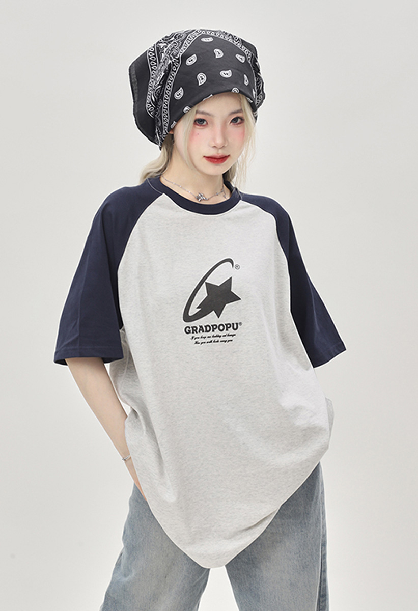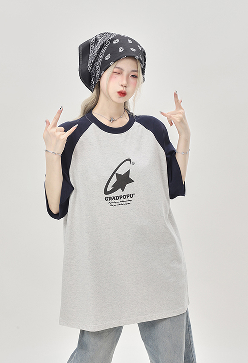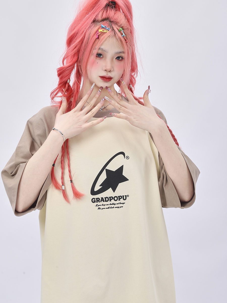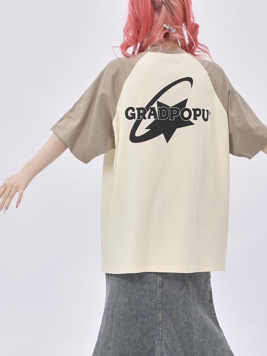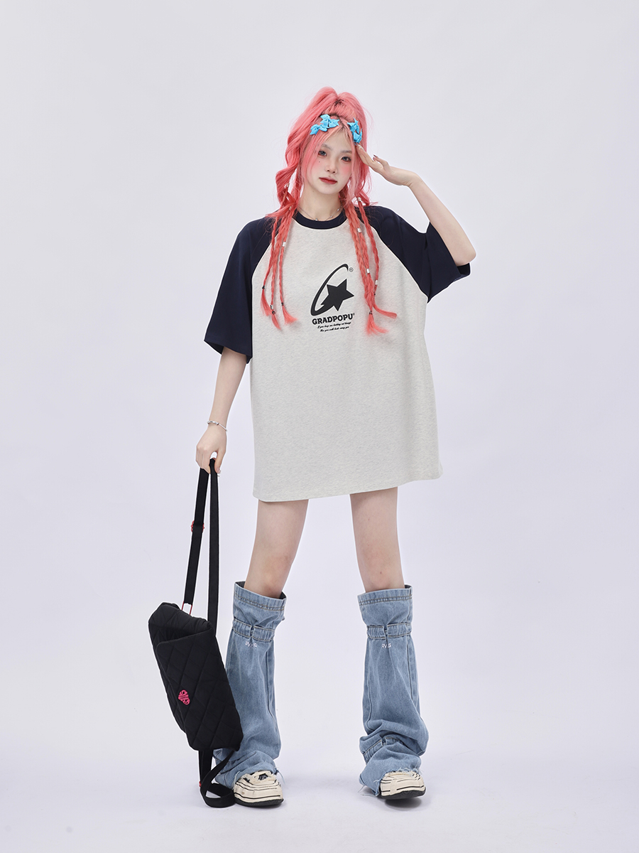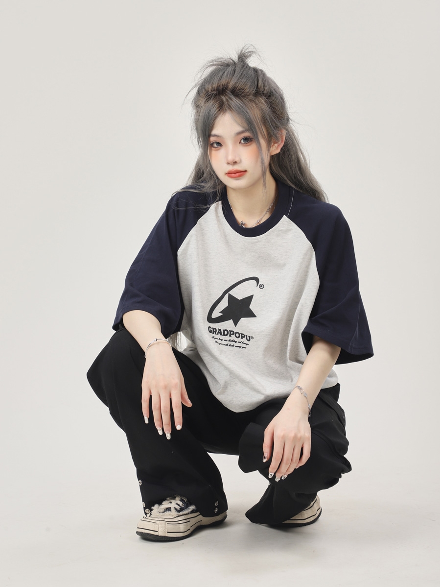 國潮美式復古重磅小眾設計感撞色插肩袖短袖t恤女寬鬆夏半袖上衣