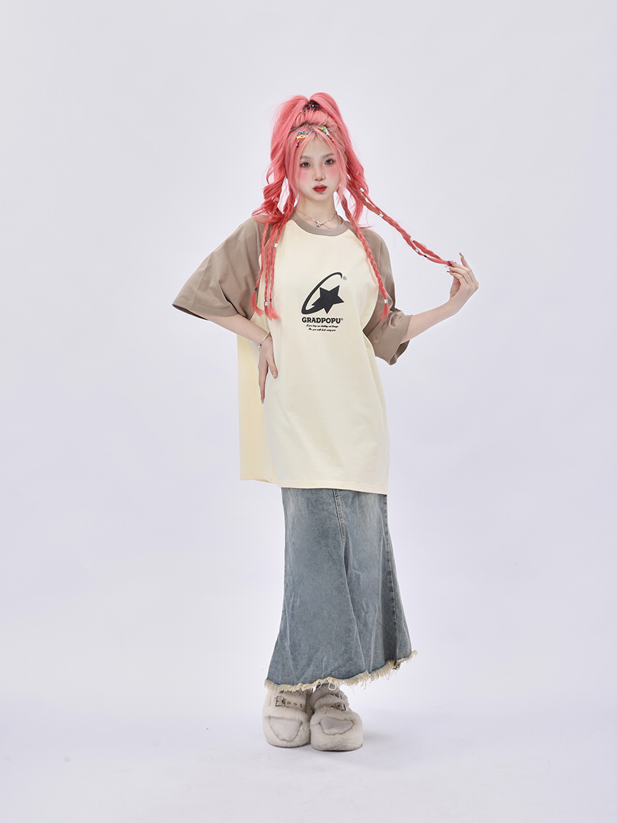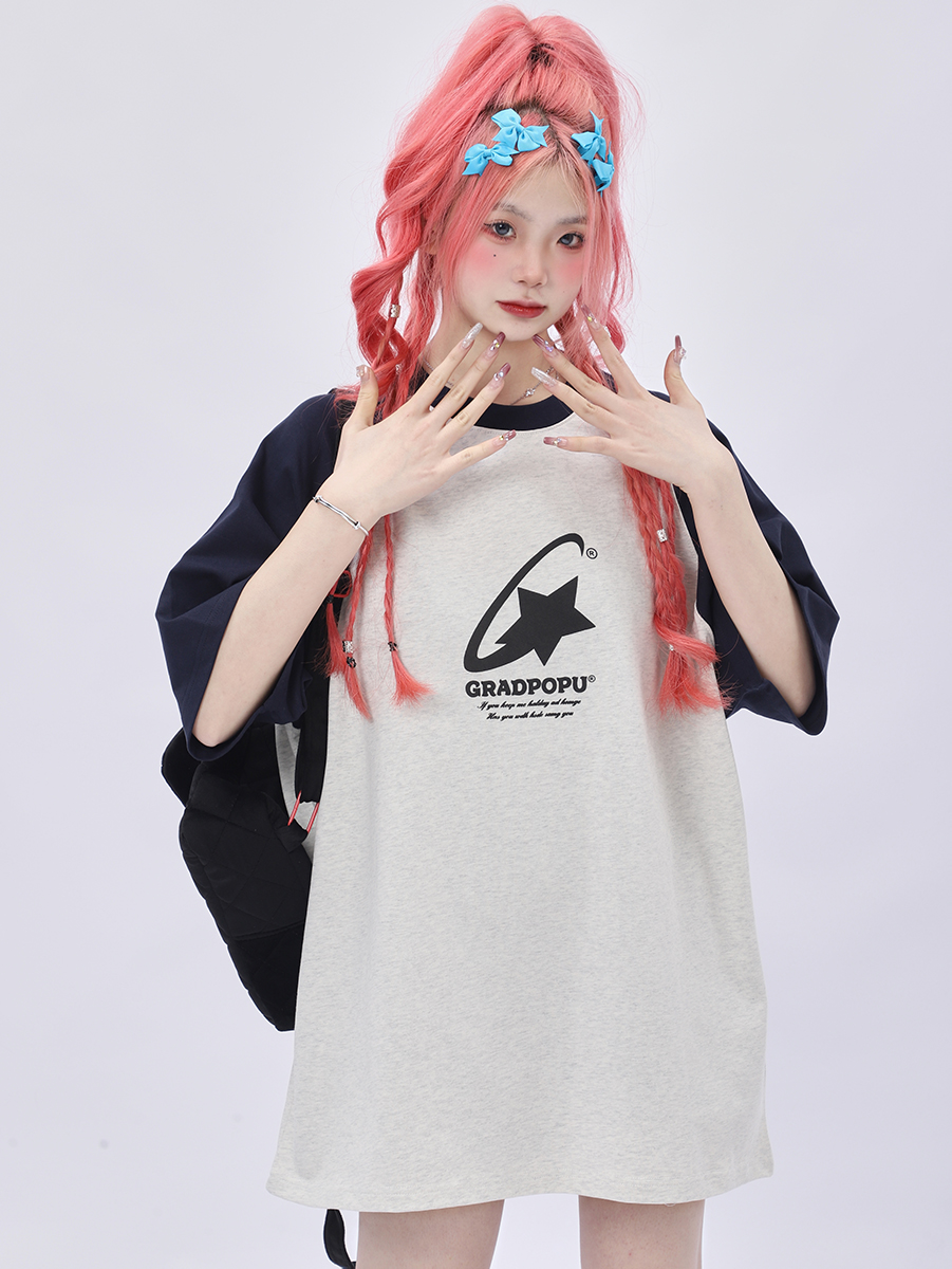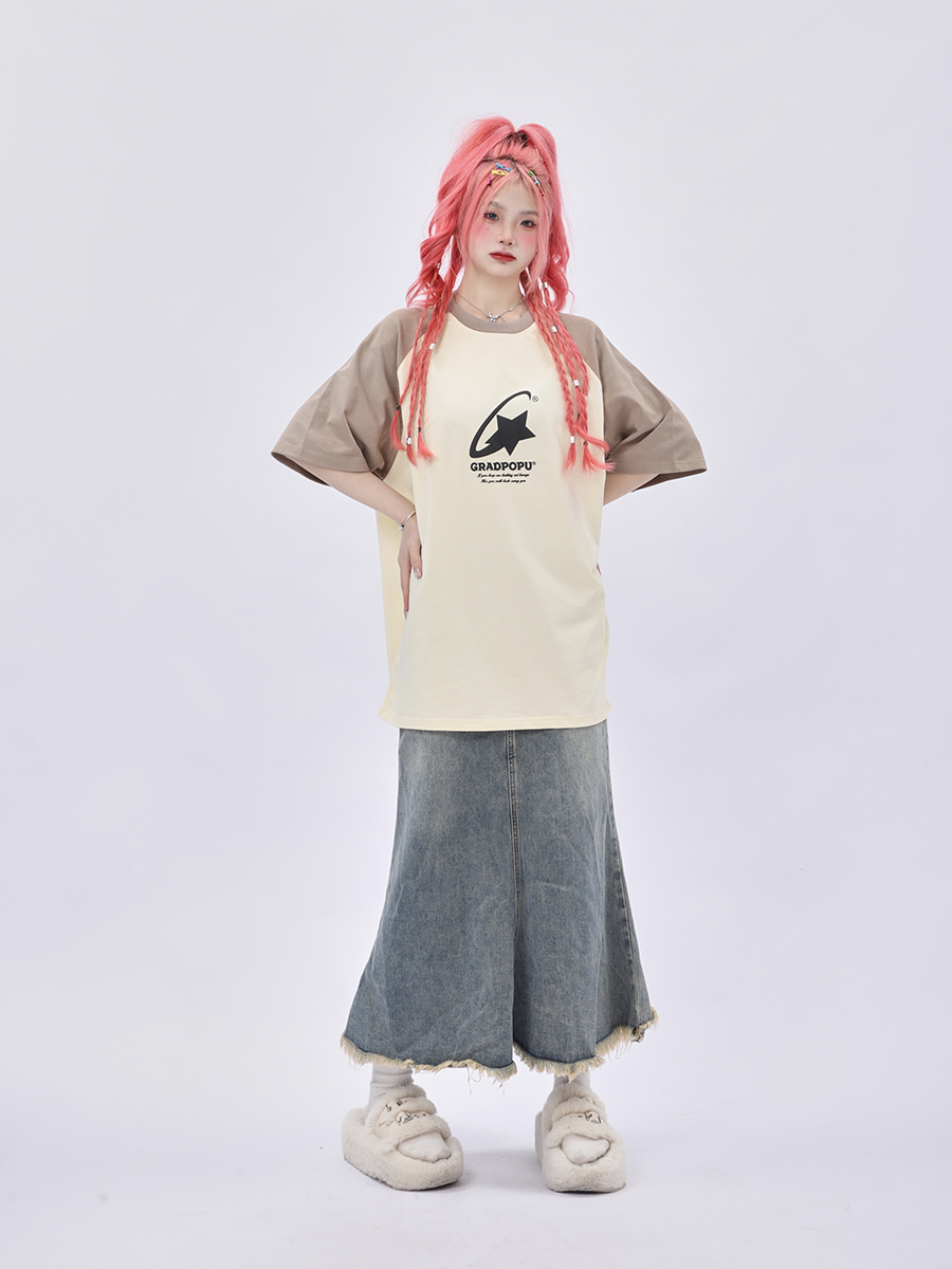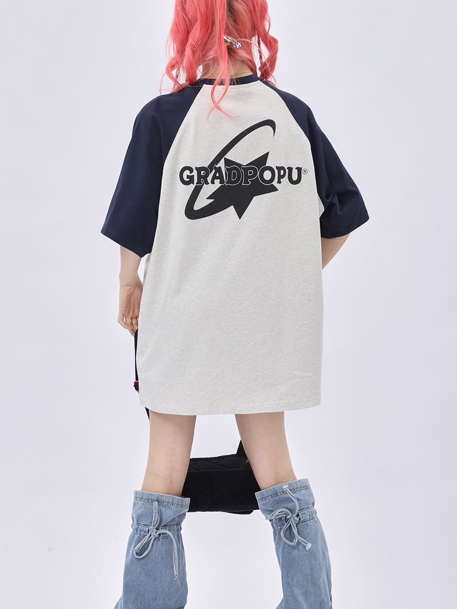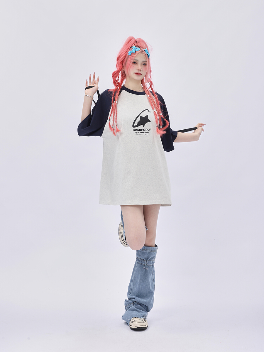 國潮美式復古重磅小眾設計感撞色插肩袖短袖t恤女寬鬆夏半袖上衣