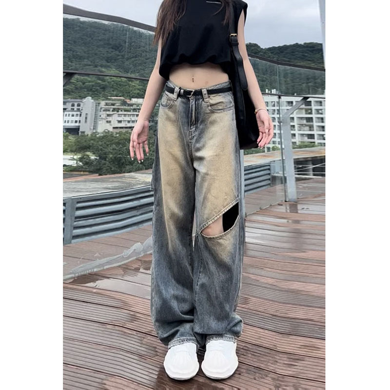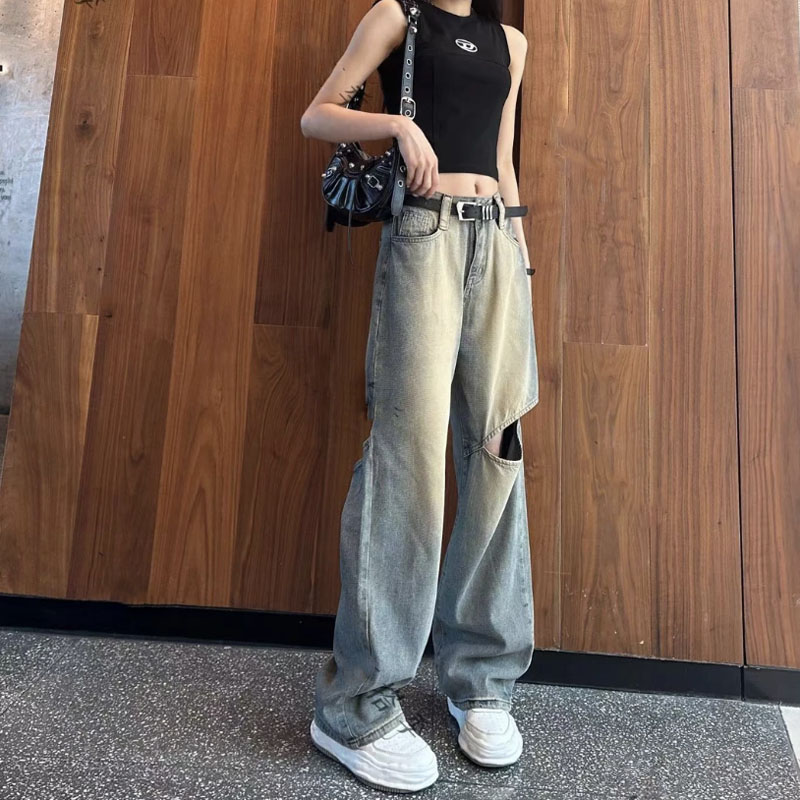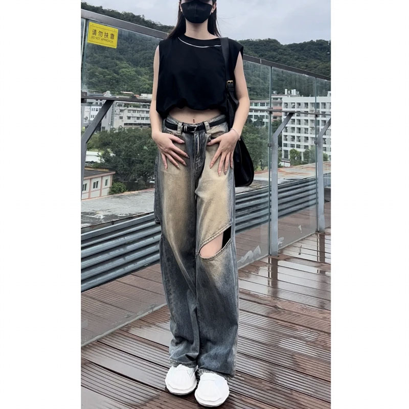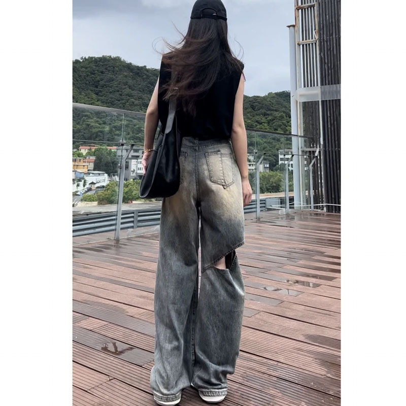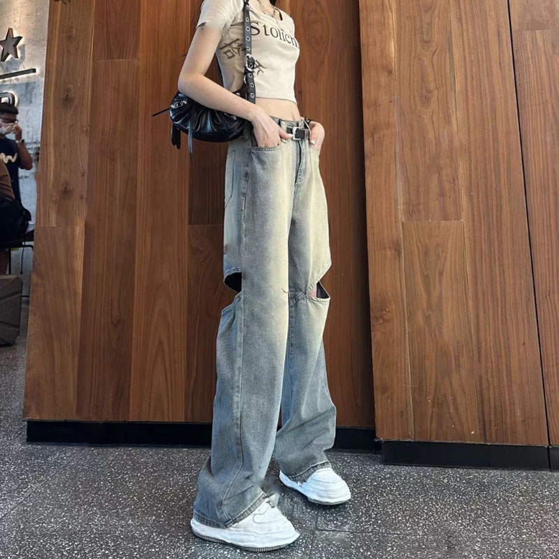 復古破洞牛仔褲女2023秋季新款時尚設計款水洗寬鬆顯瘦直筒寬褲