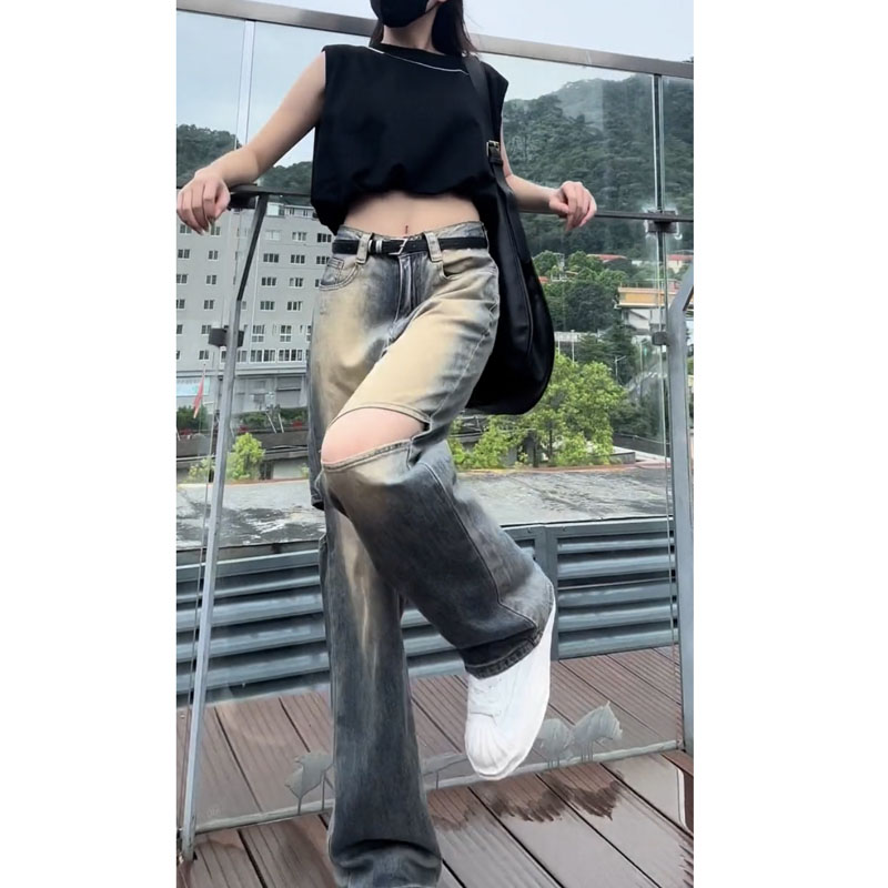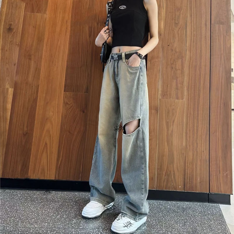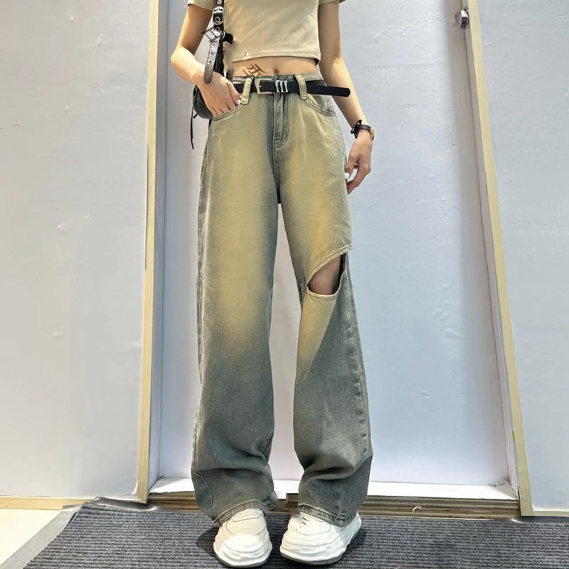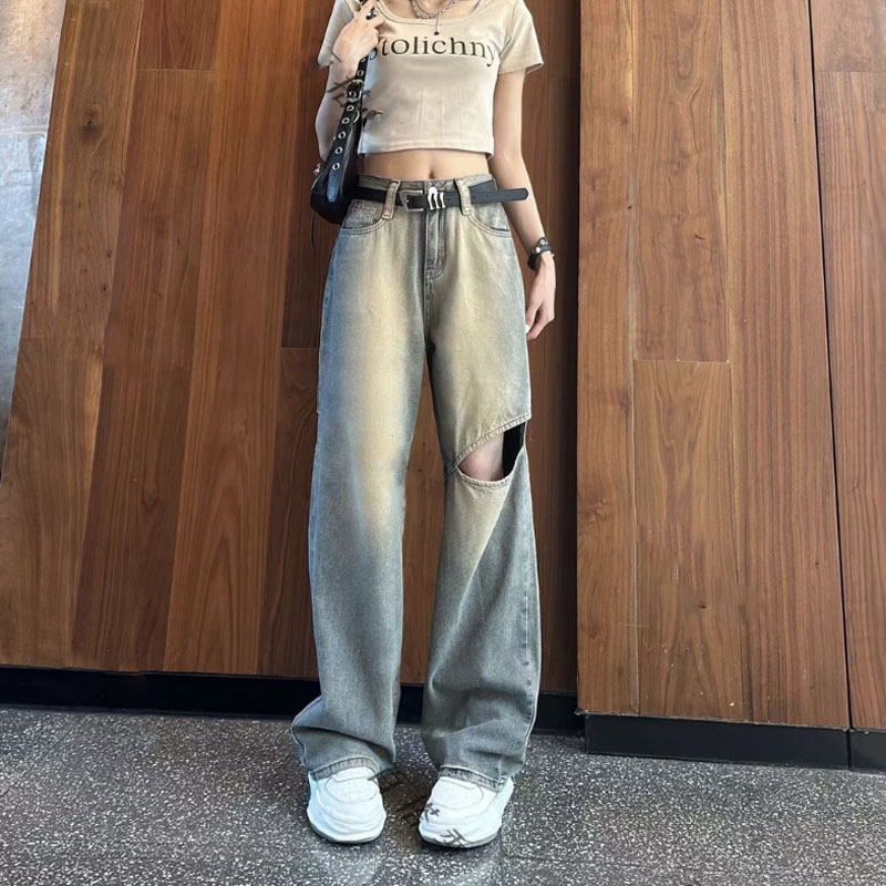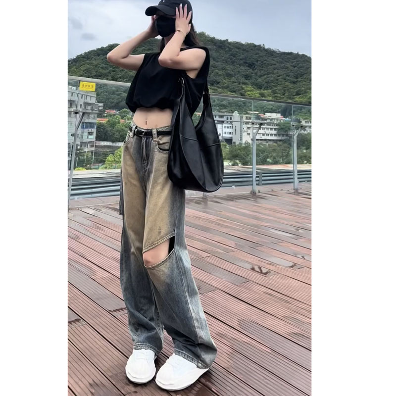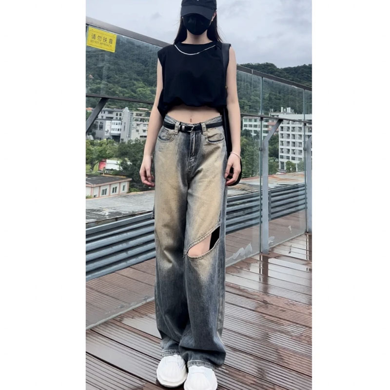 復古破洞牛仔褲女2023秋季新款時尚設計款水洗寬鬆顯瘦直筒寬褲