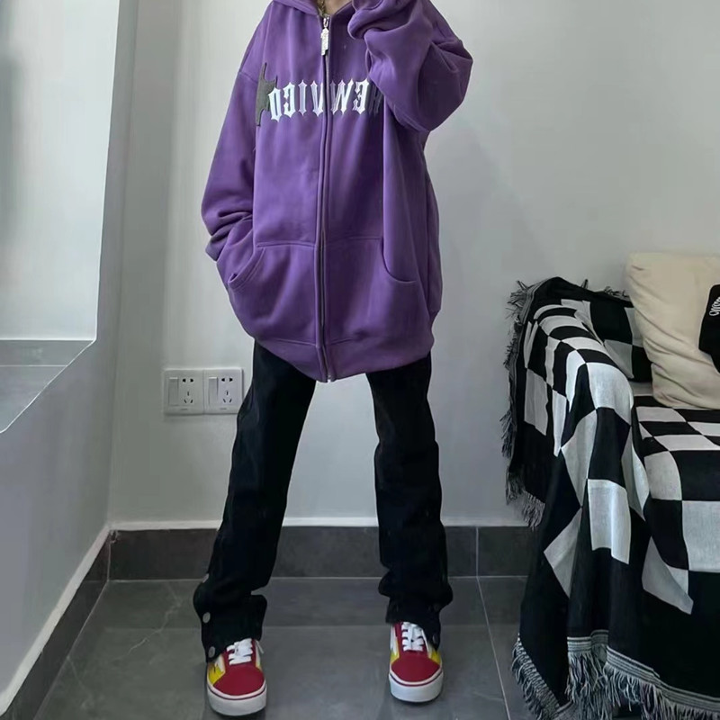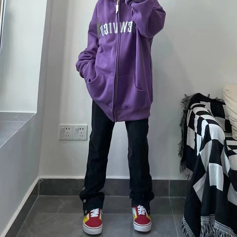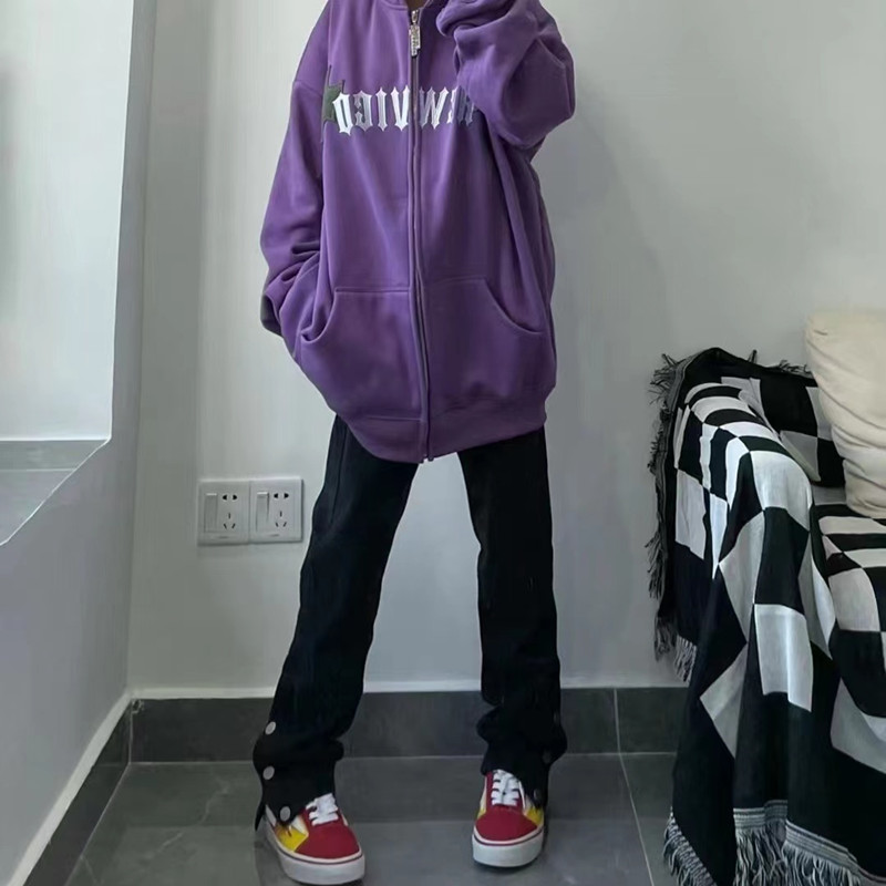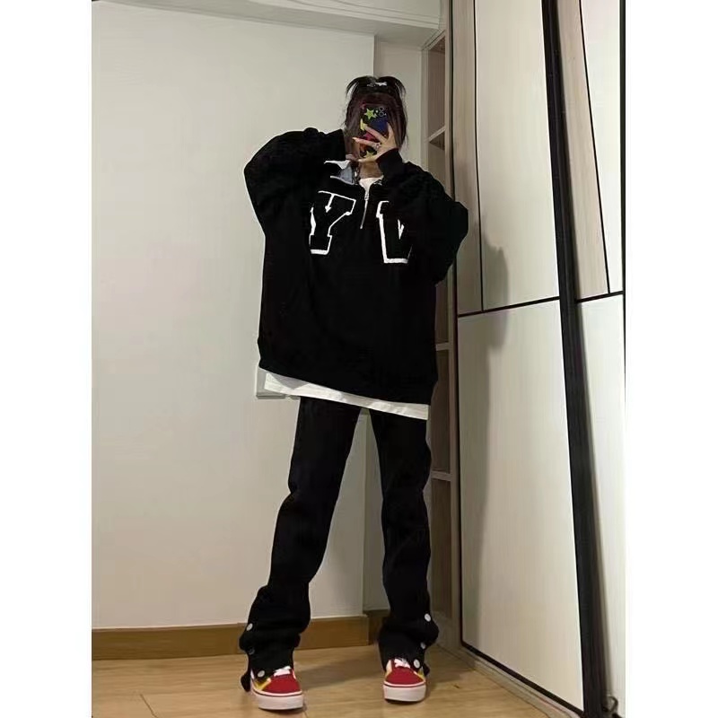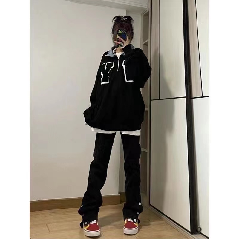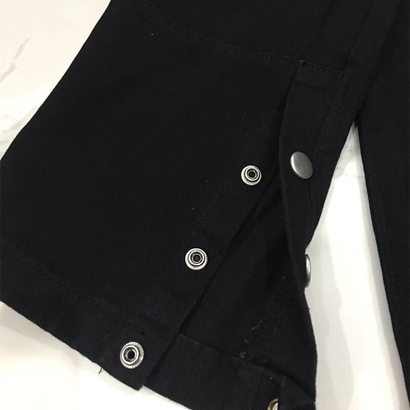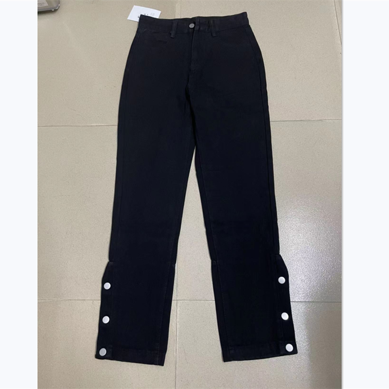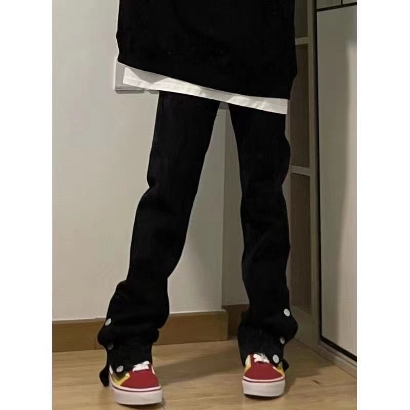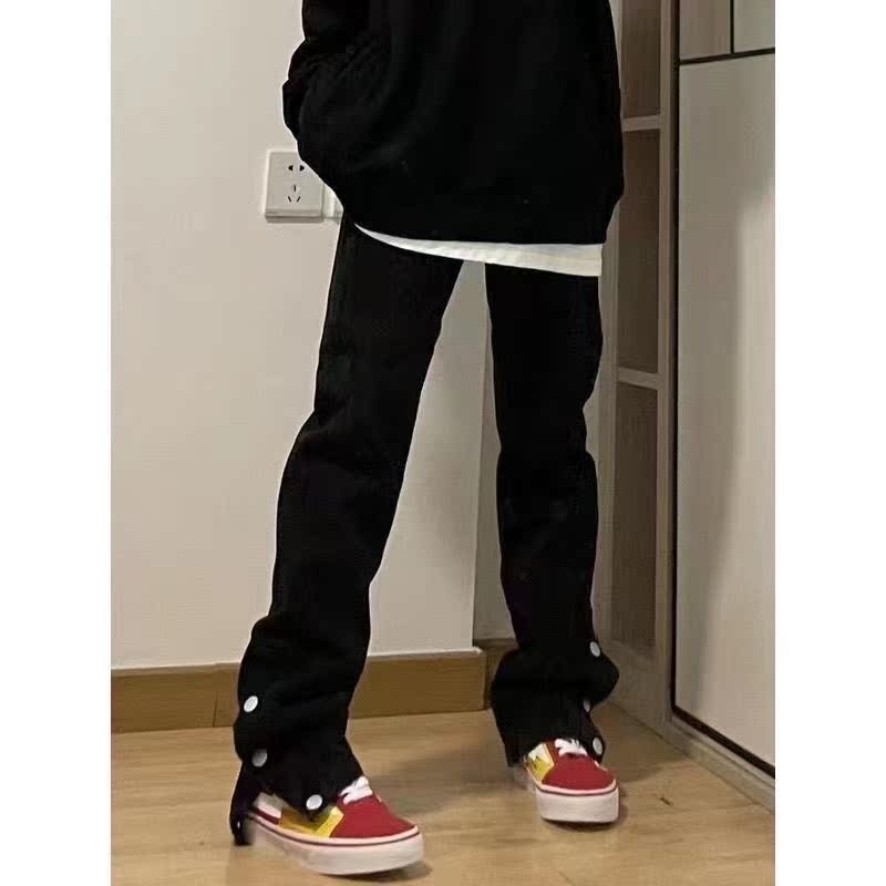 美式排扣牛仔褲女春秋新款高腰修身開叉直筒長褲黑色高街褲子ins