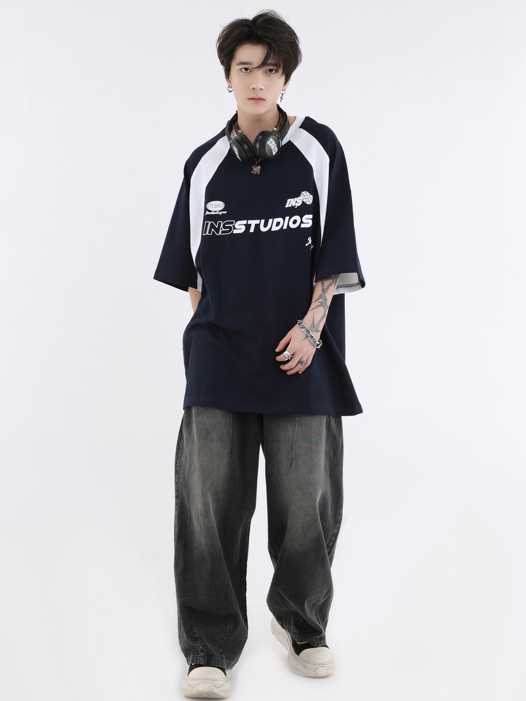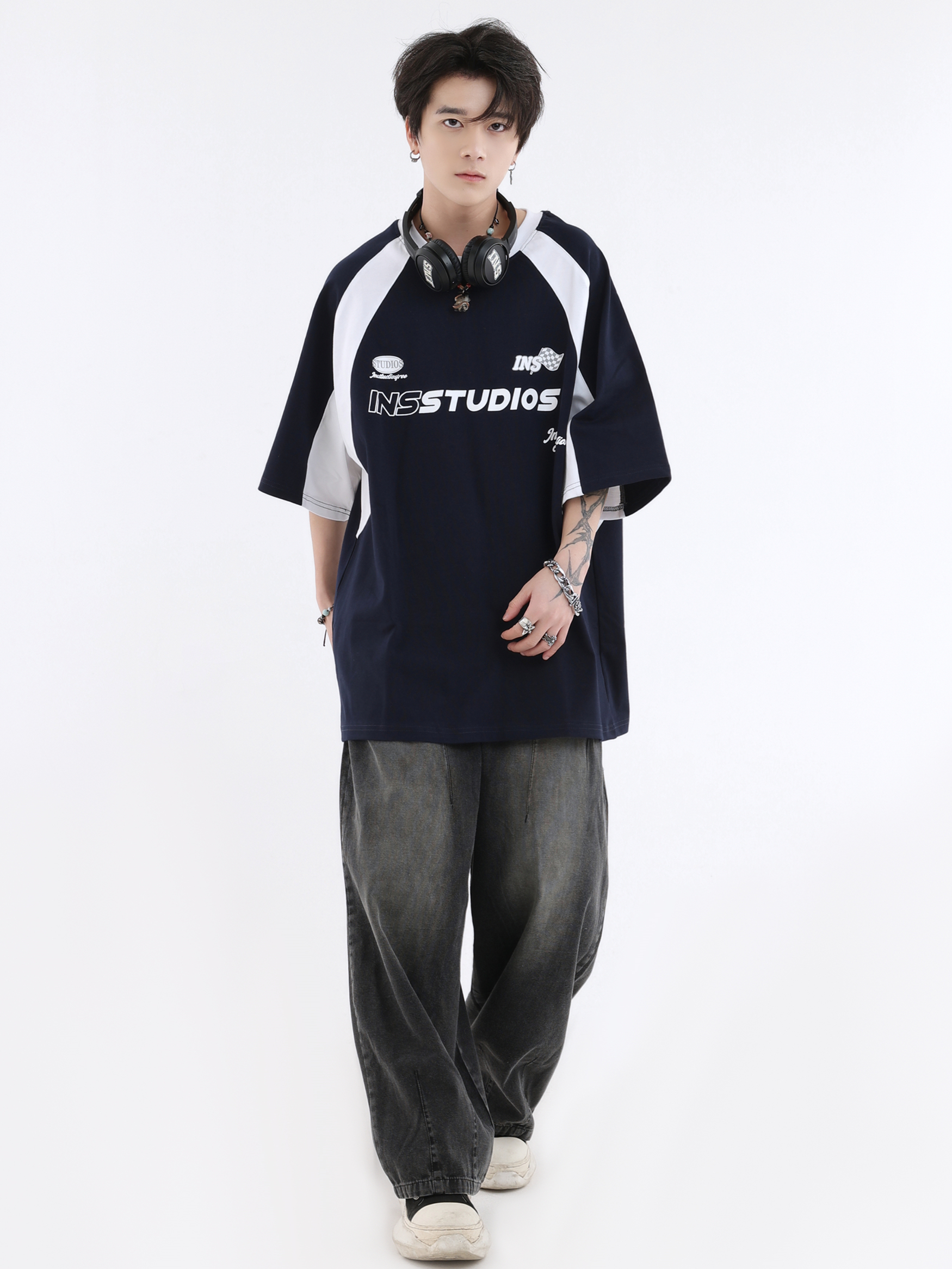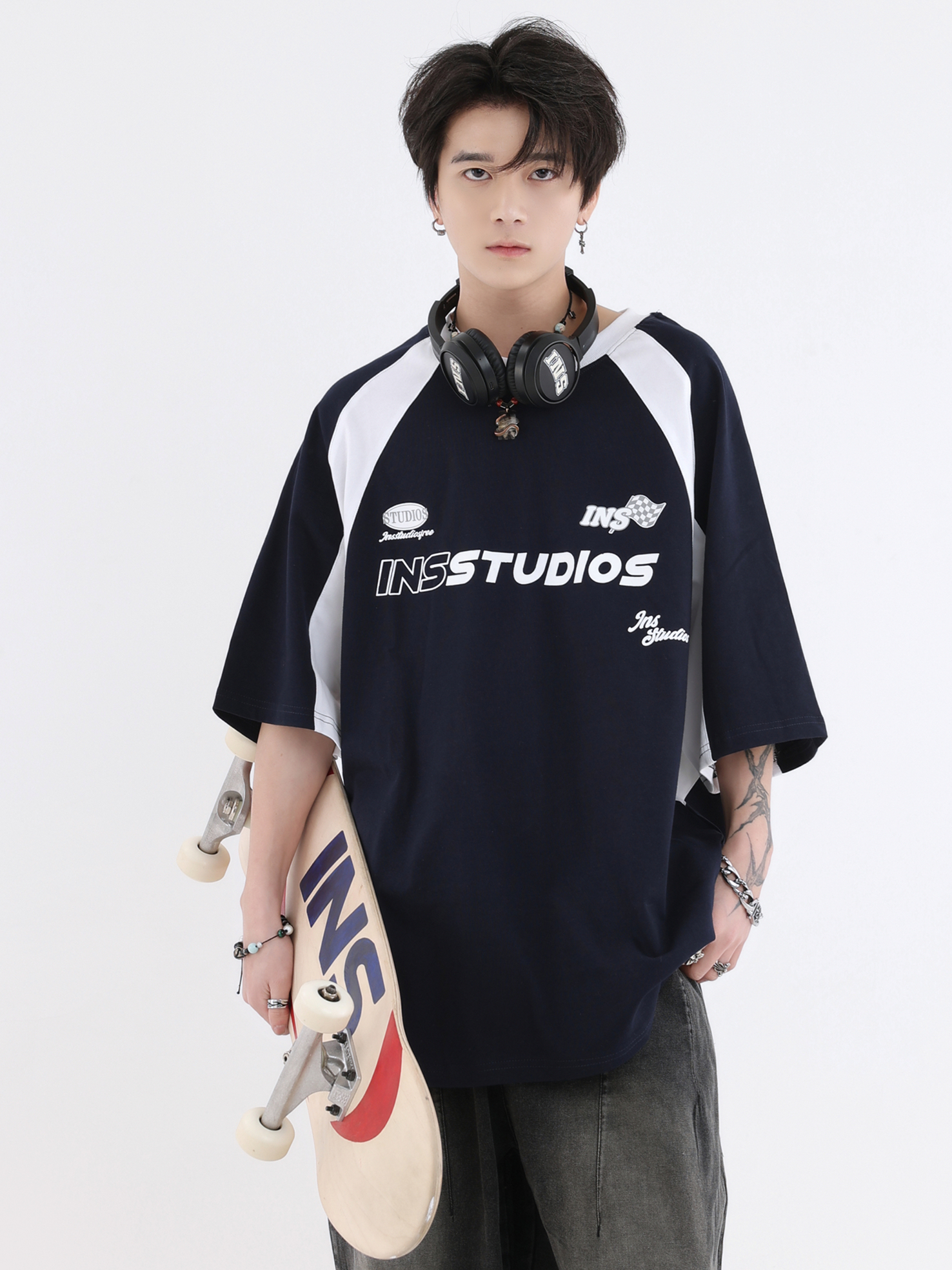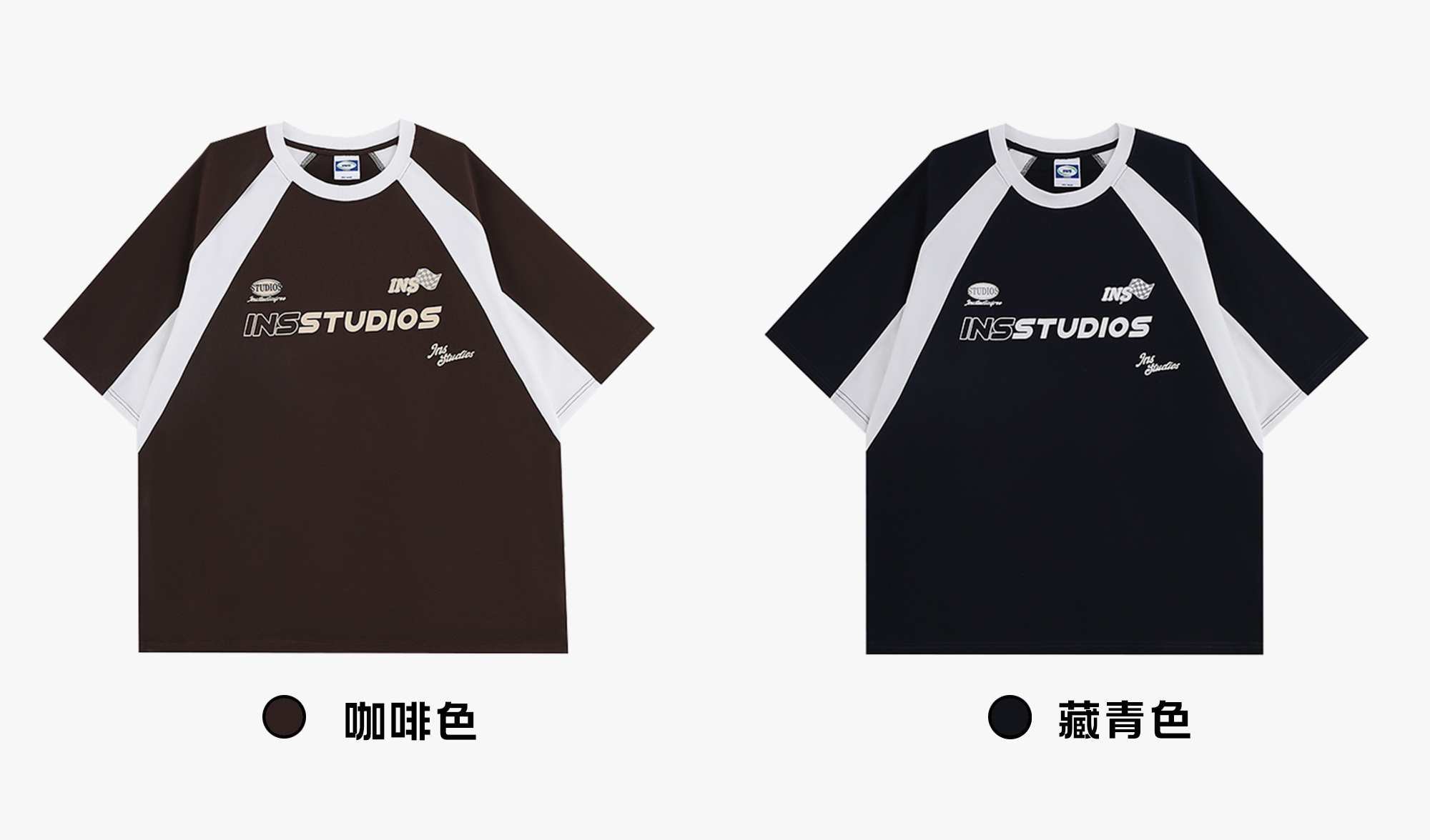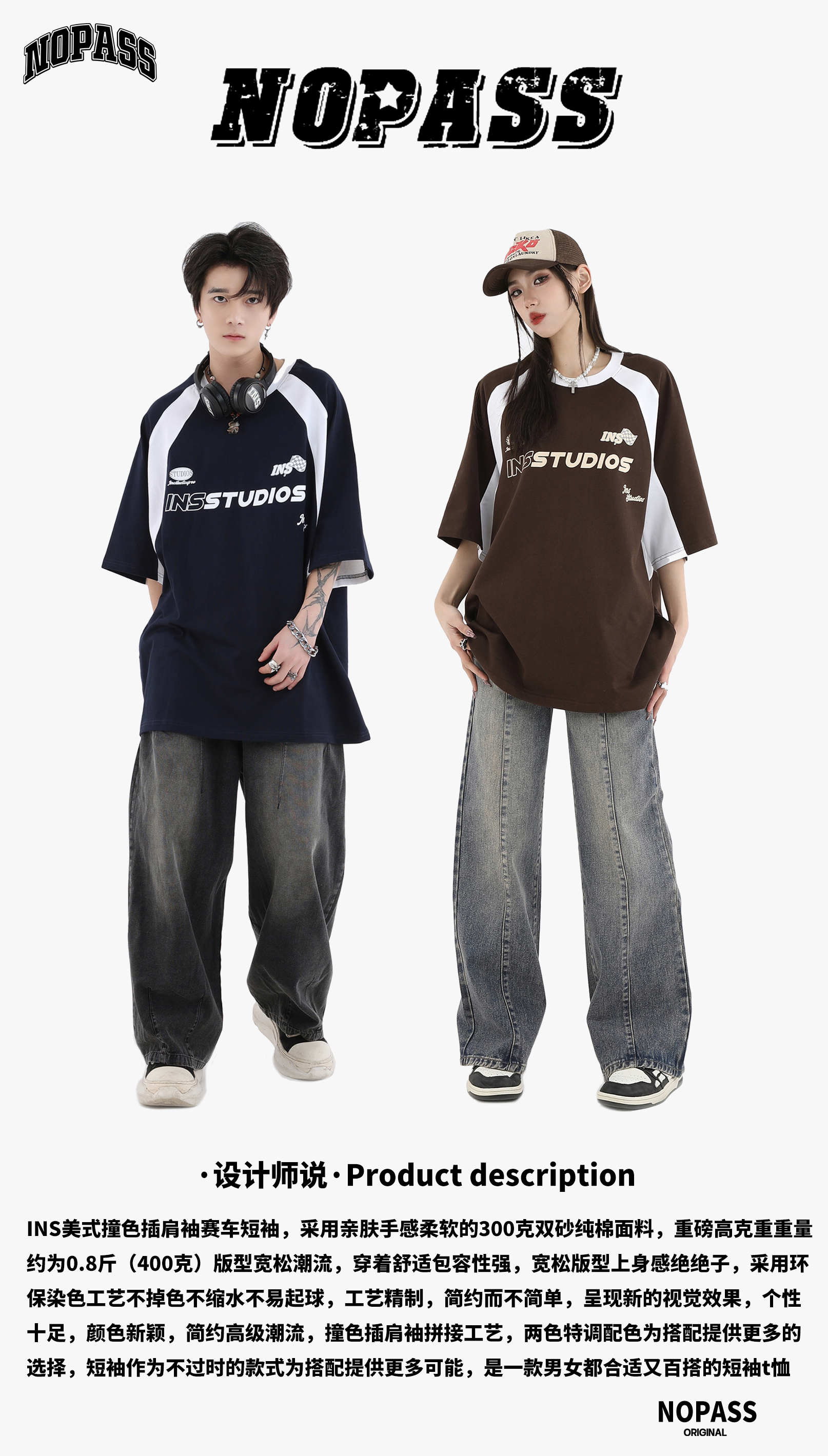 NOPASS 國潮牌情侶自制美式撞色插肩袖賽車短袖寬鬆拼接純棉T恤女