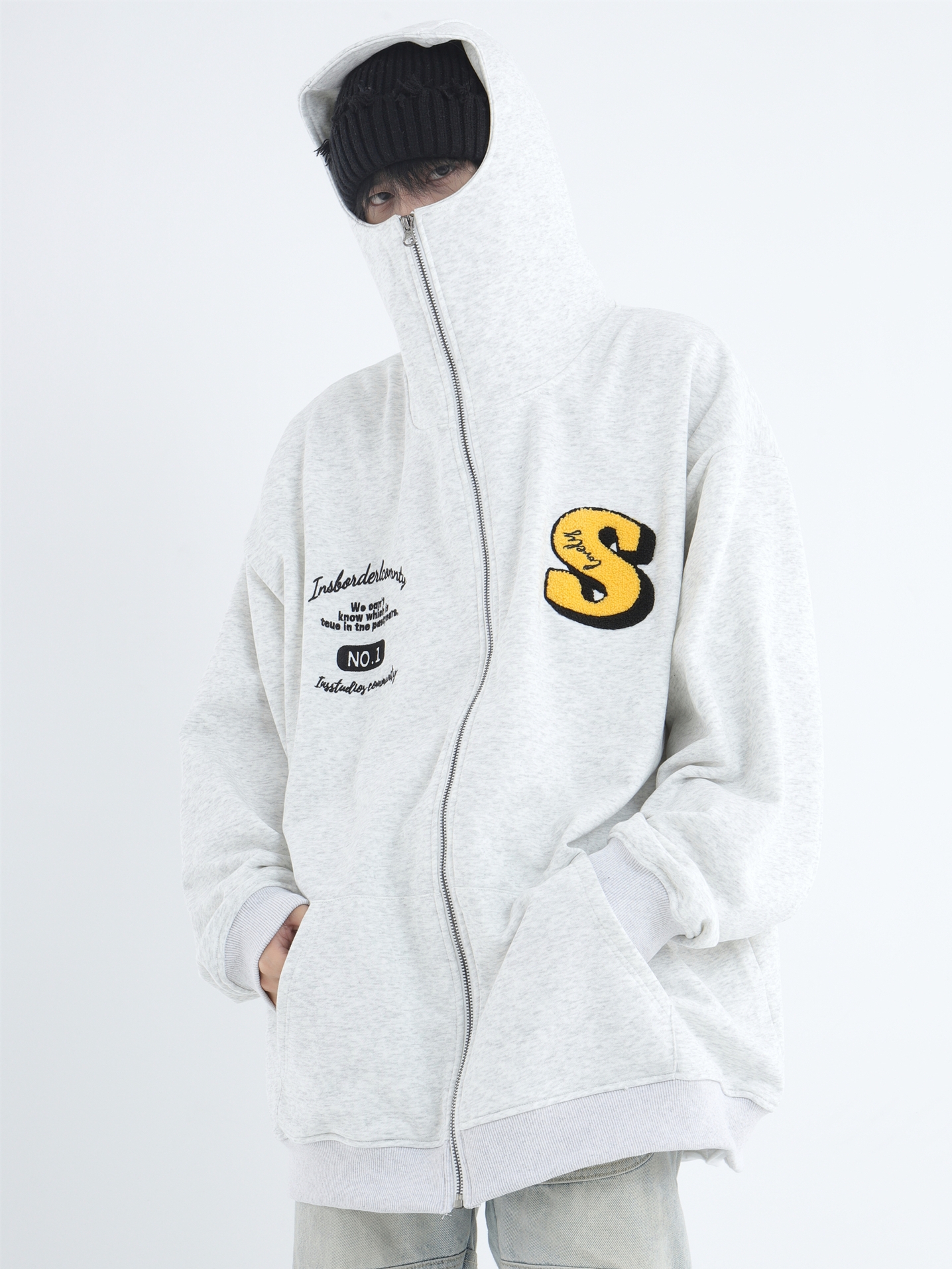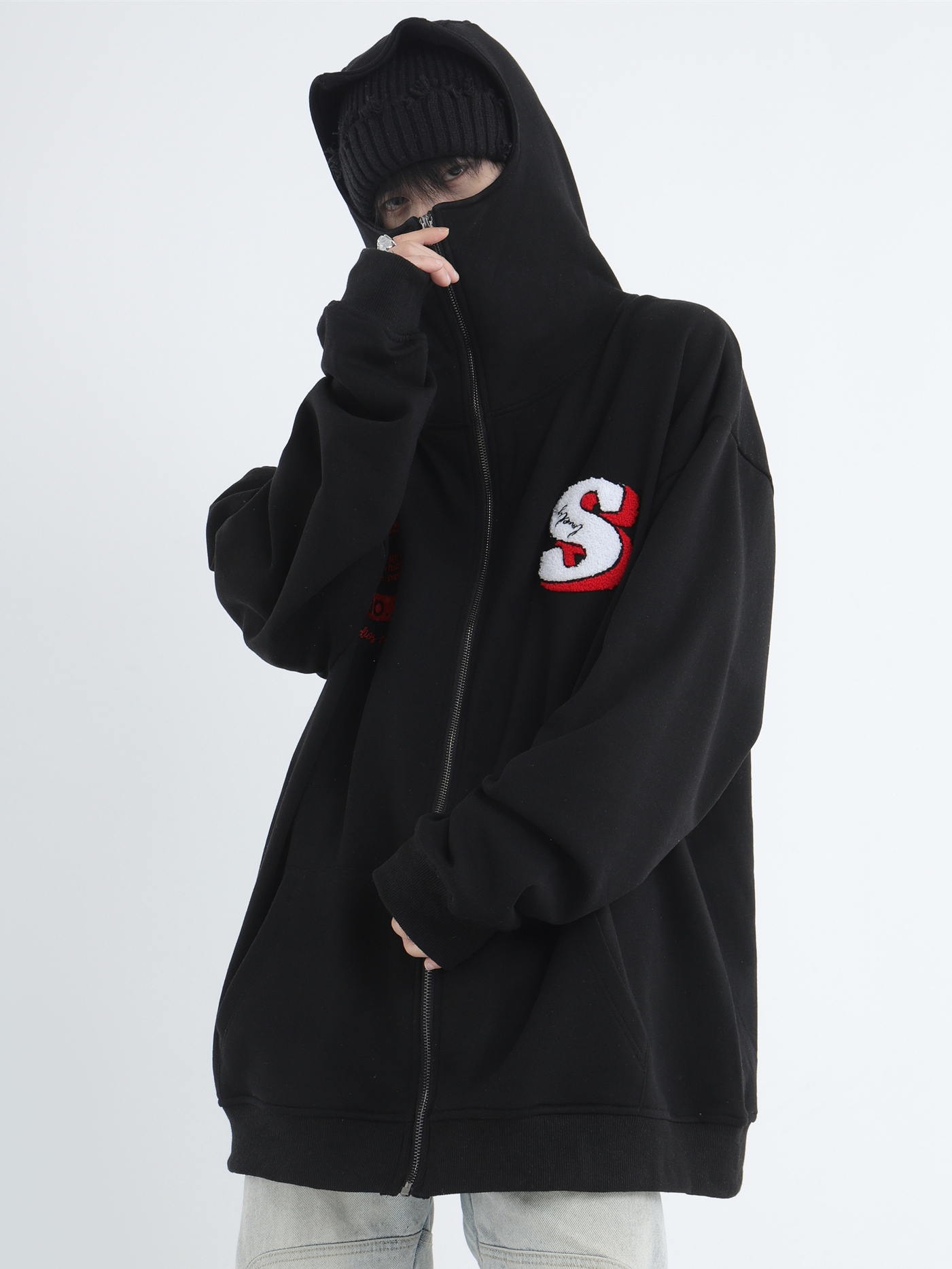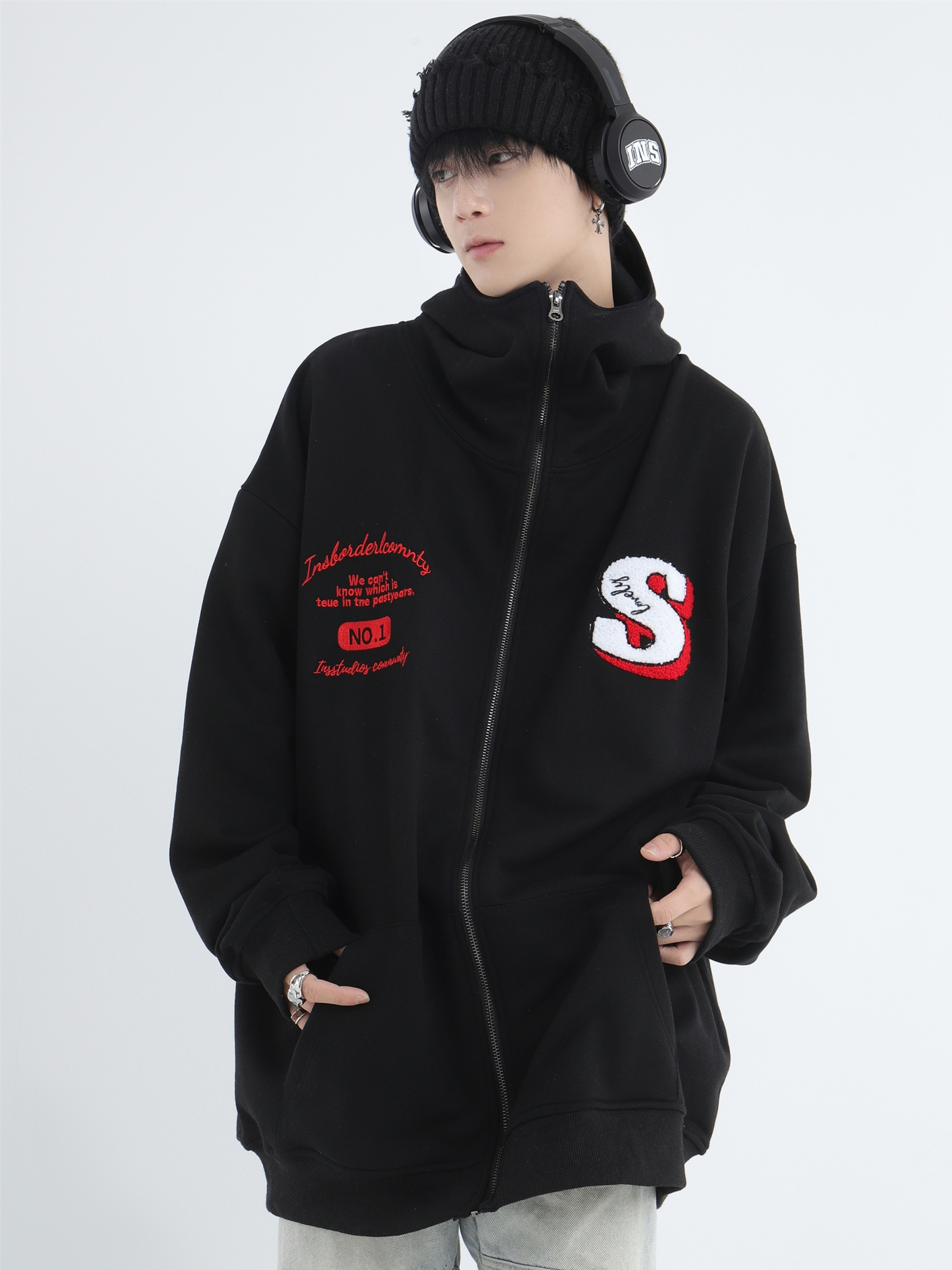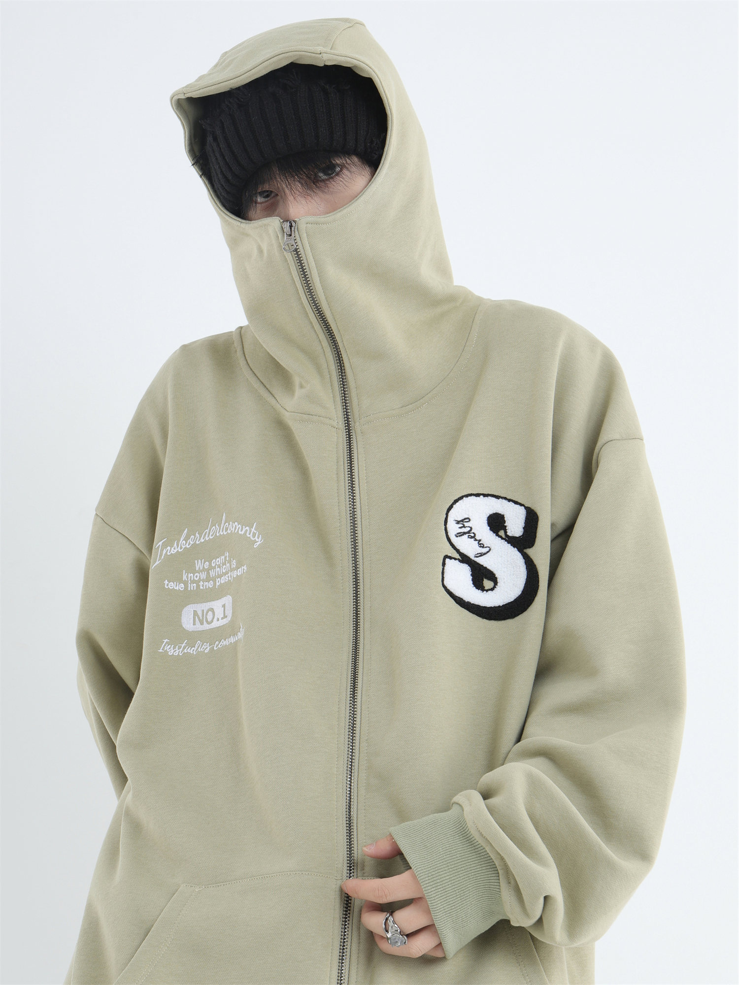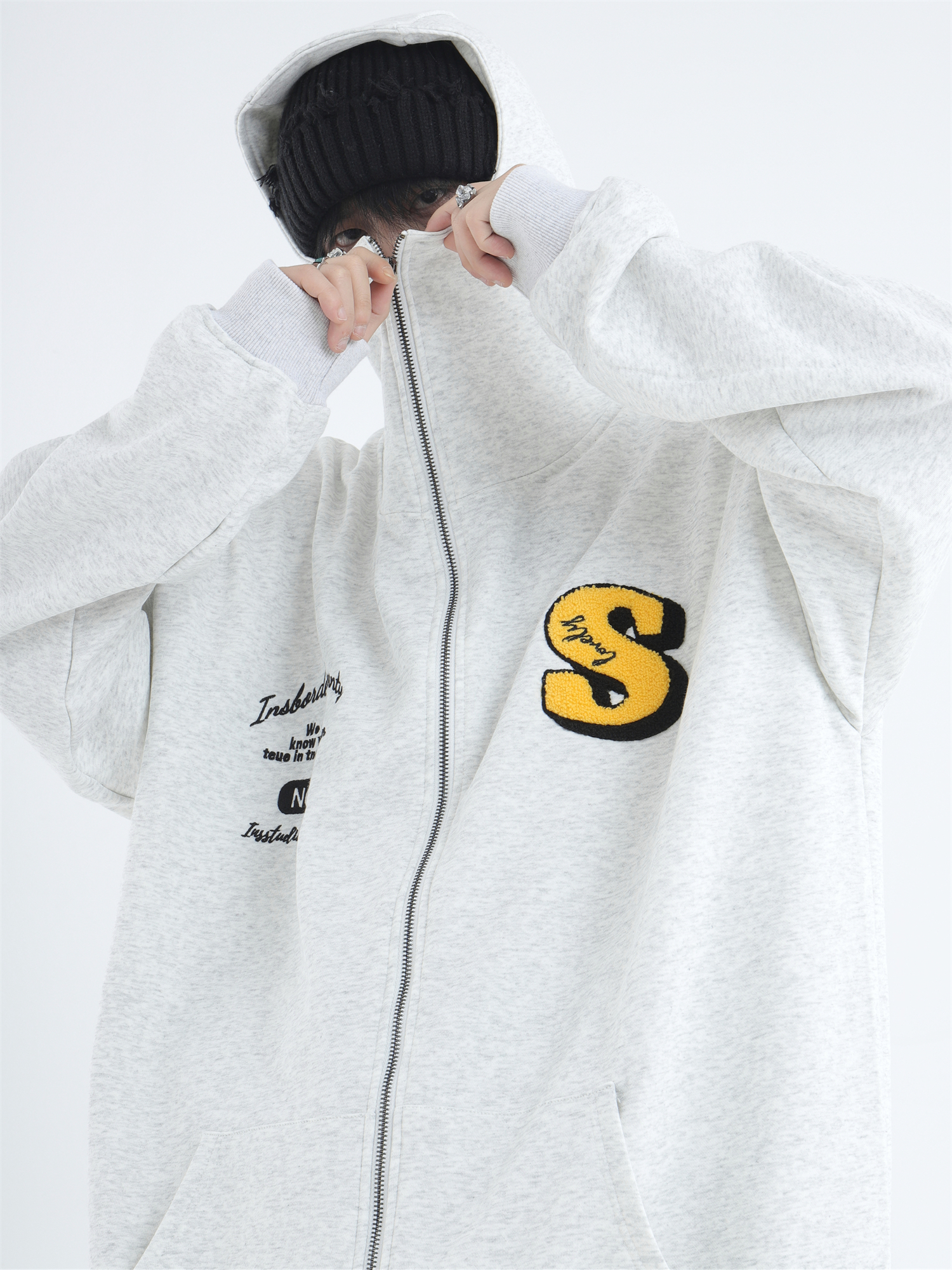 INSstudios 忍者帽植絨開衫厚棉T自制國潮情侶美式寬鬆拉鍊外套男