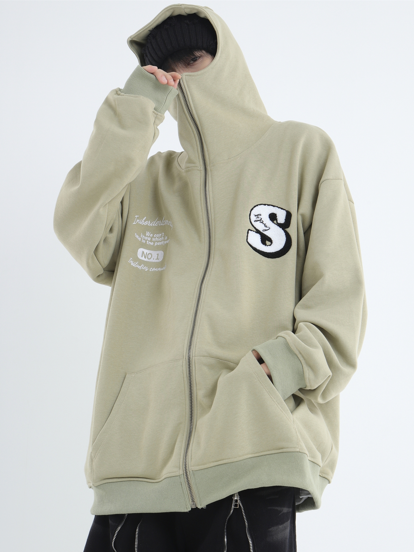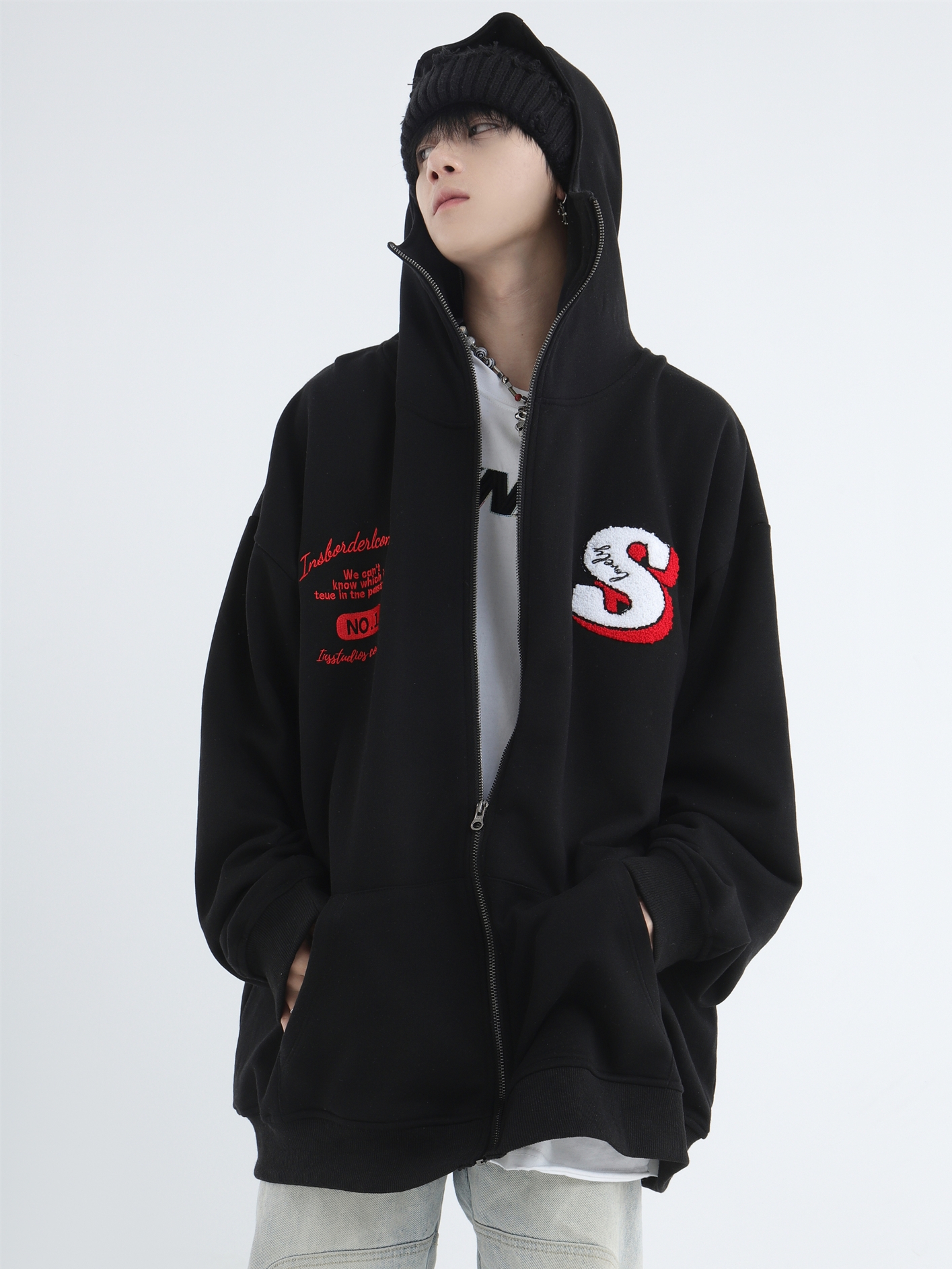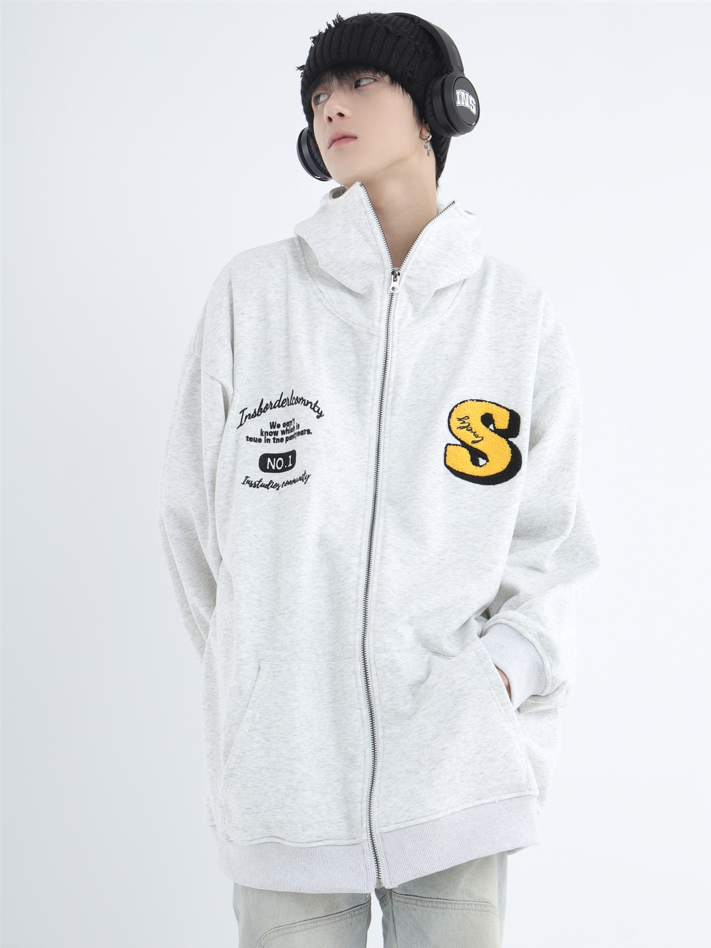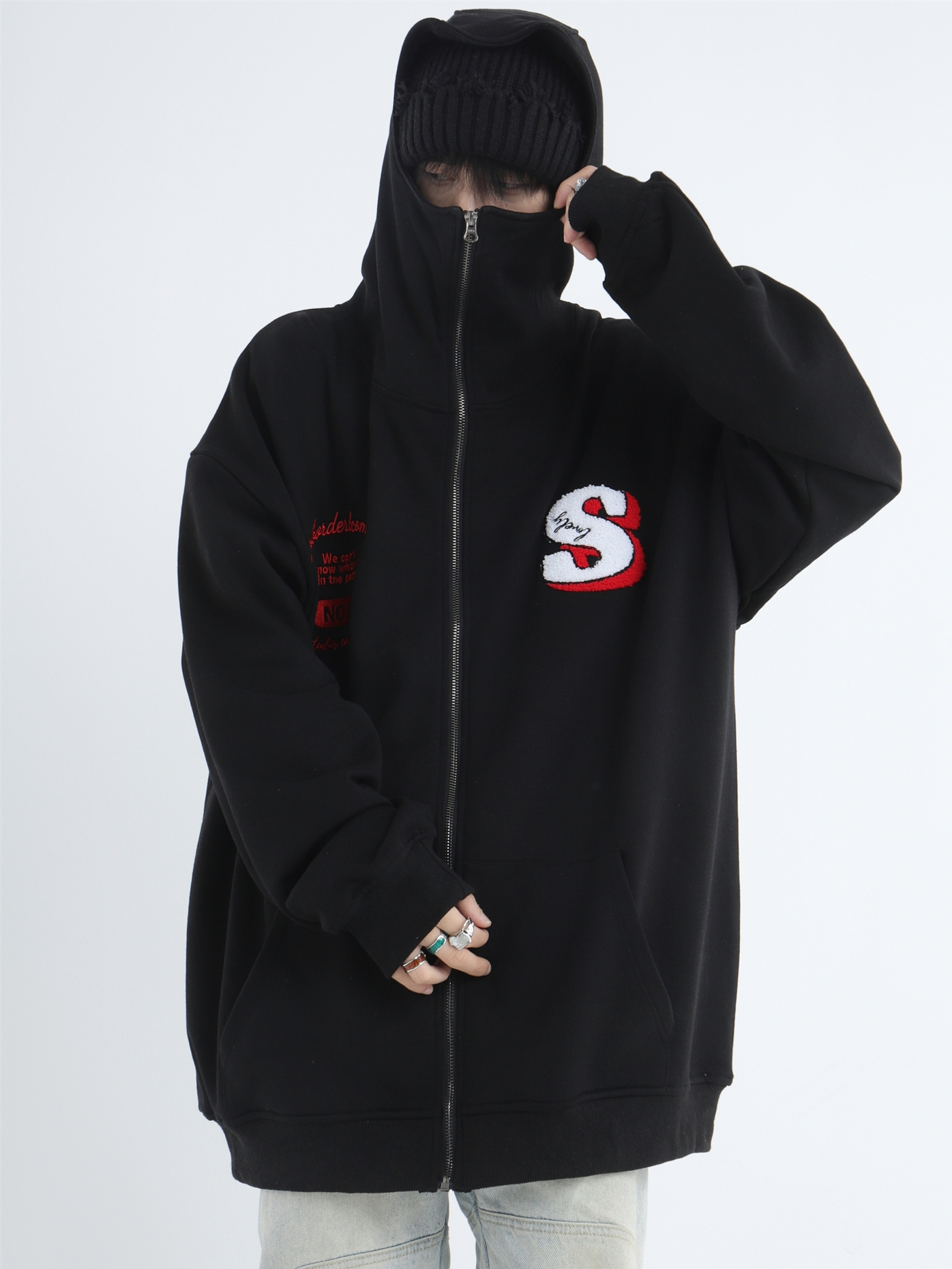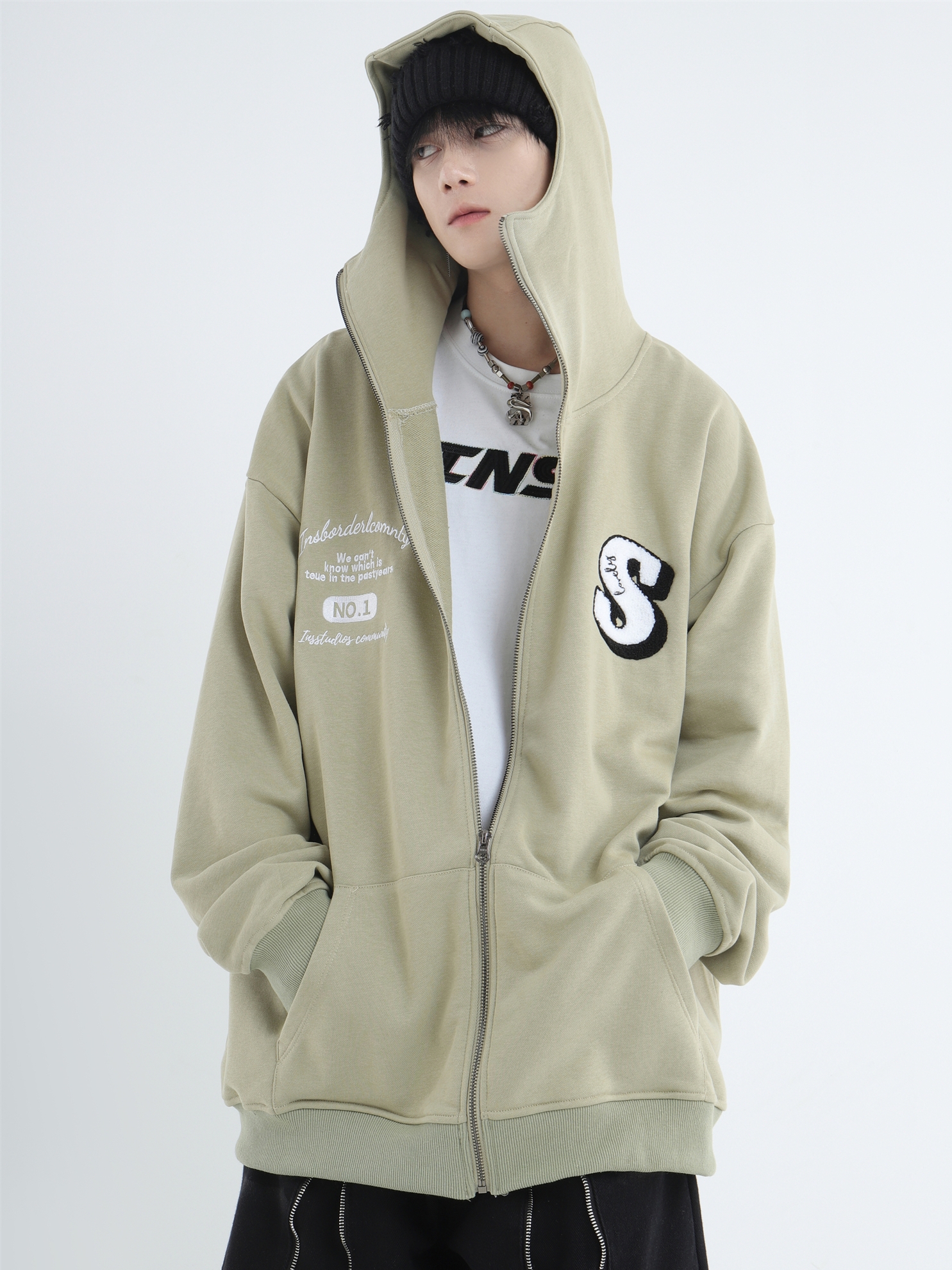 INSstudios 忍者帽植絨開衫厚棉T自制國潮情侶美式寬鬆拉鍊外套男