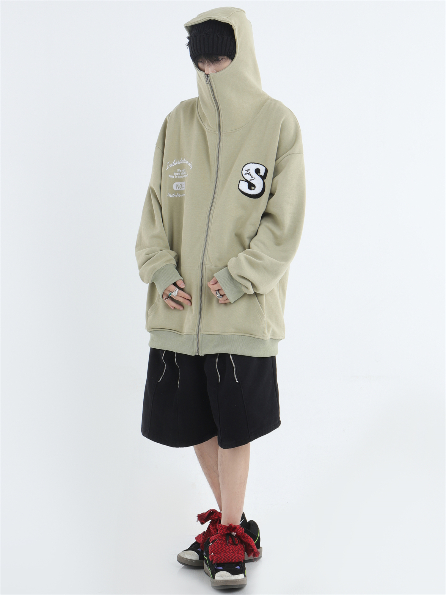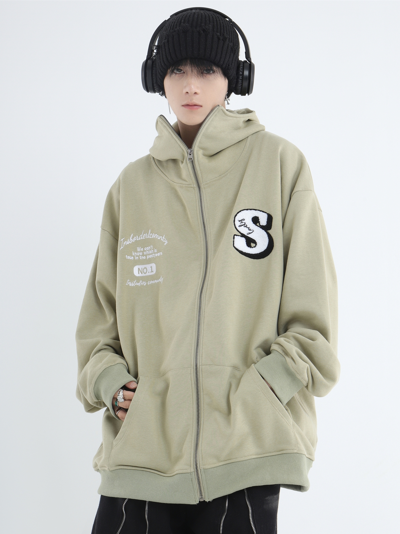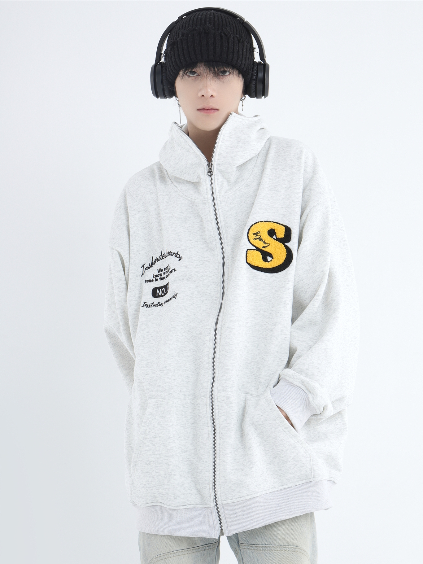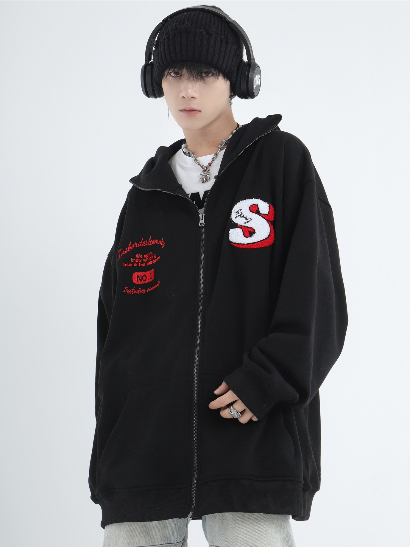INSstudios 忍者帽植絨開衫厚棉T自制國潮情侶美式寬鬆拉鍊外套男