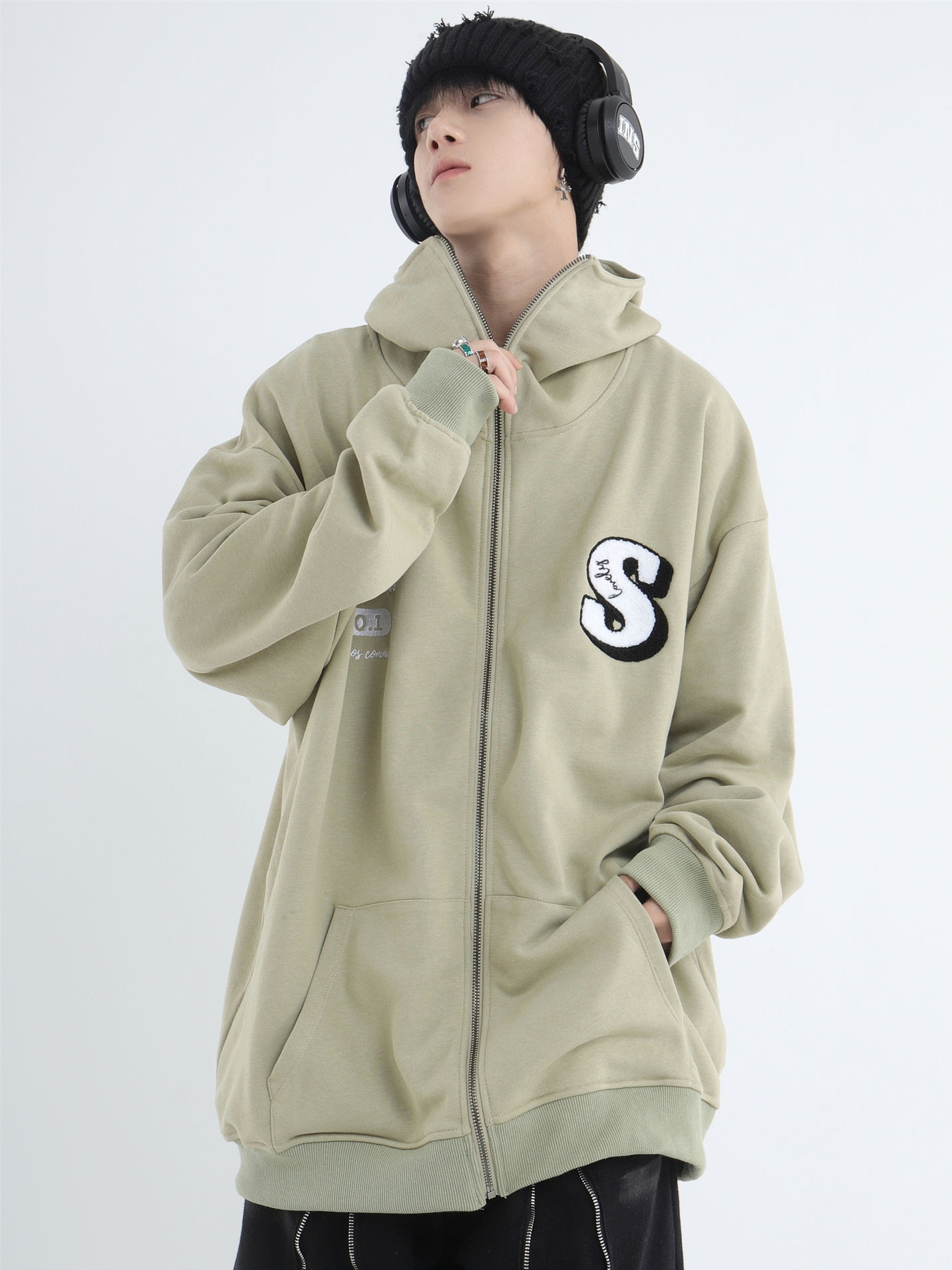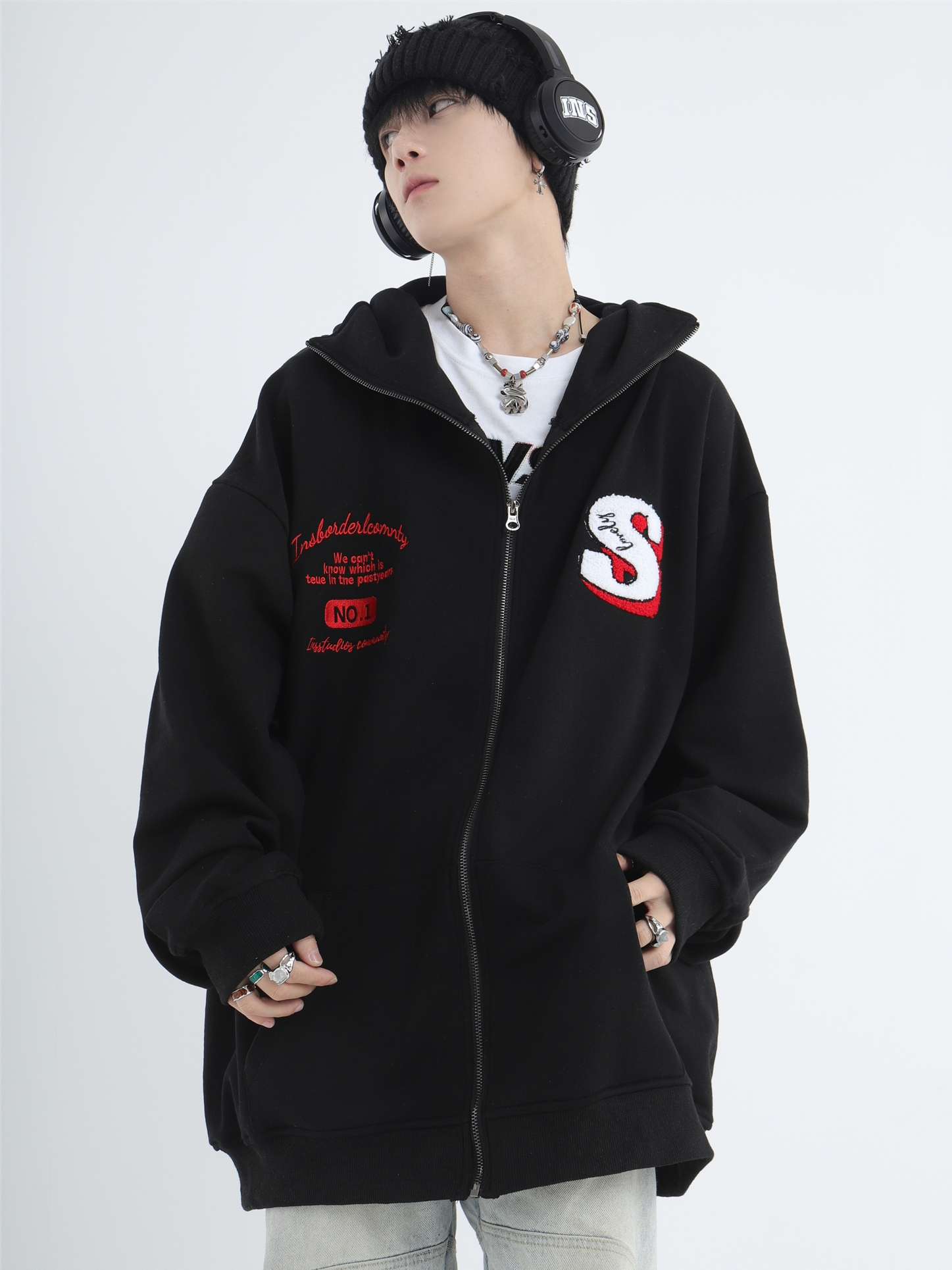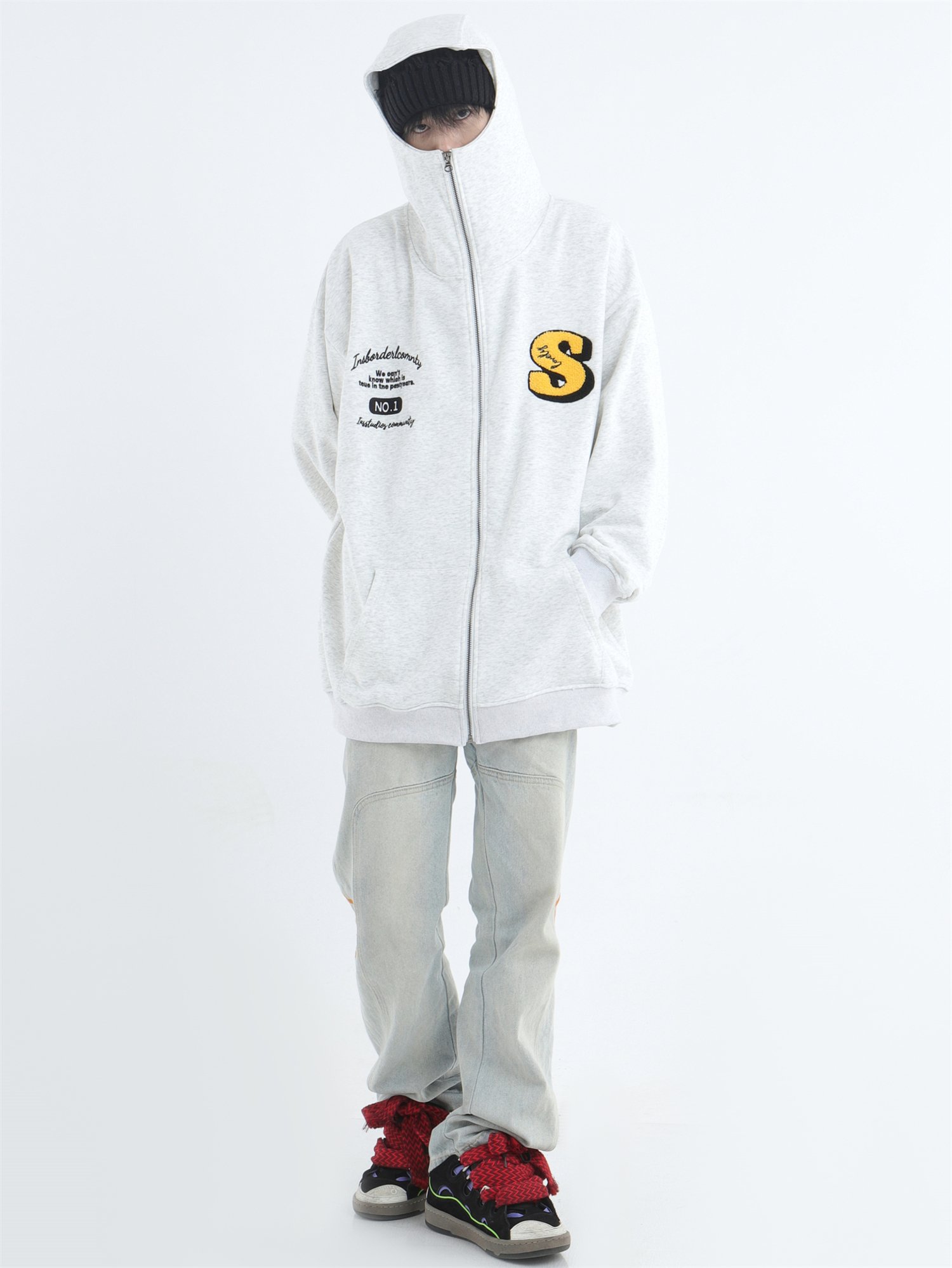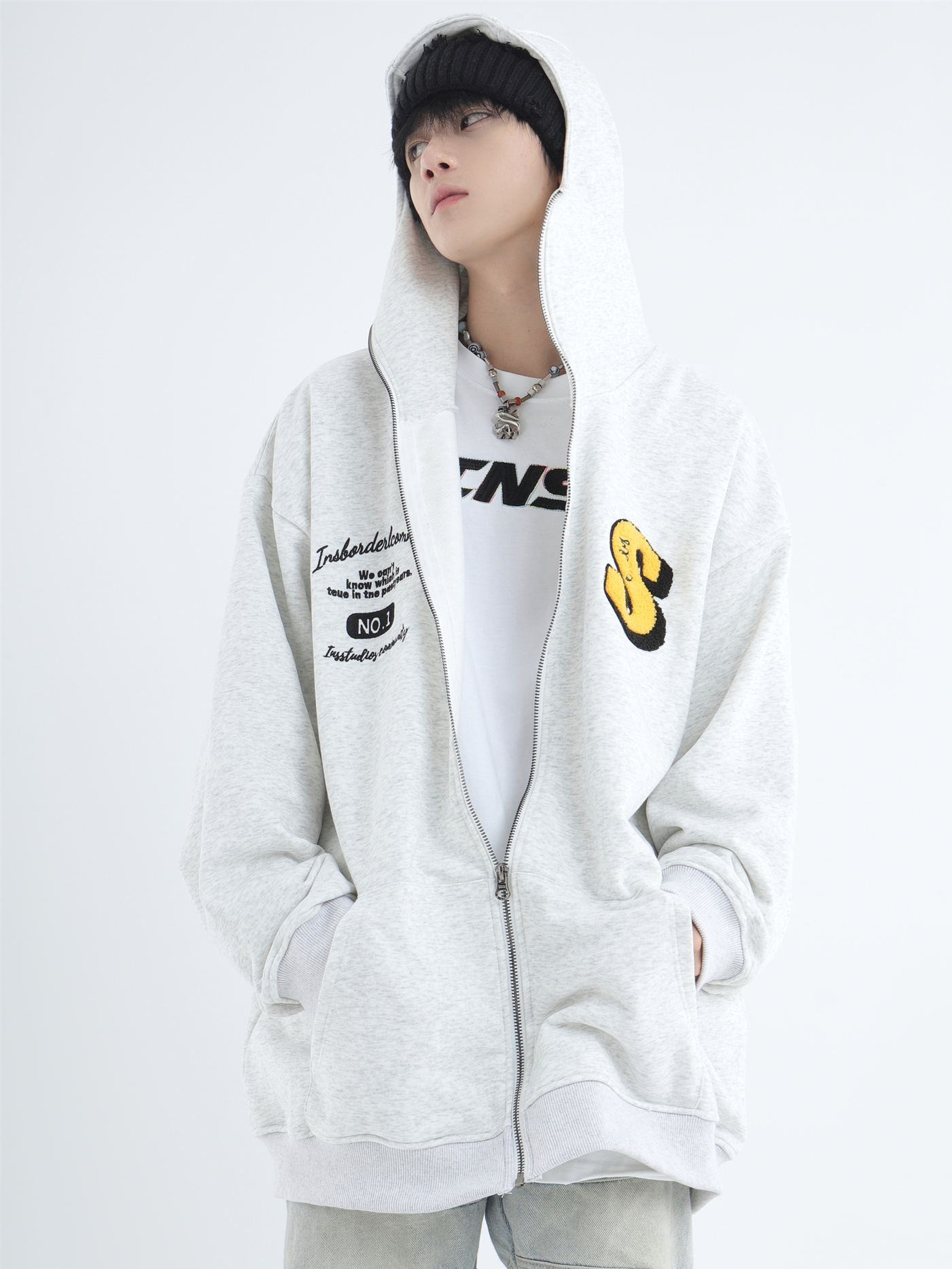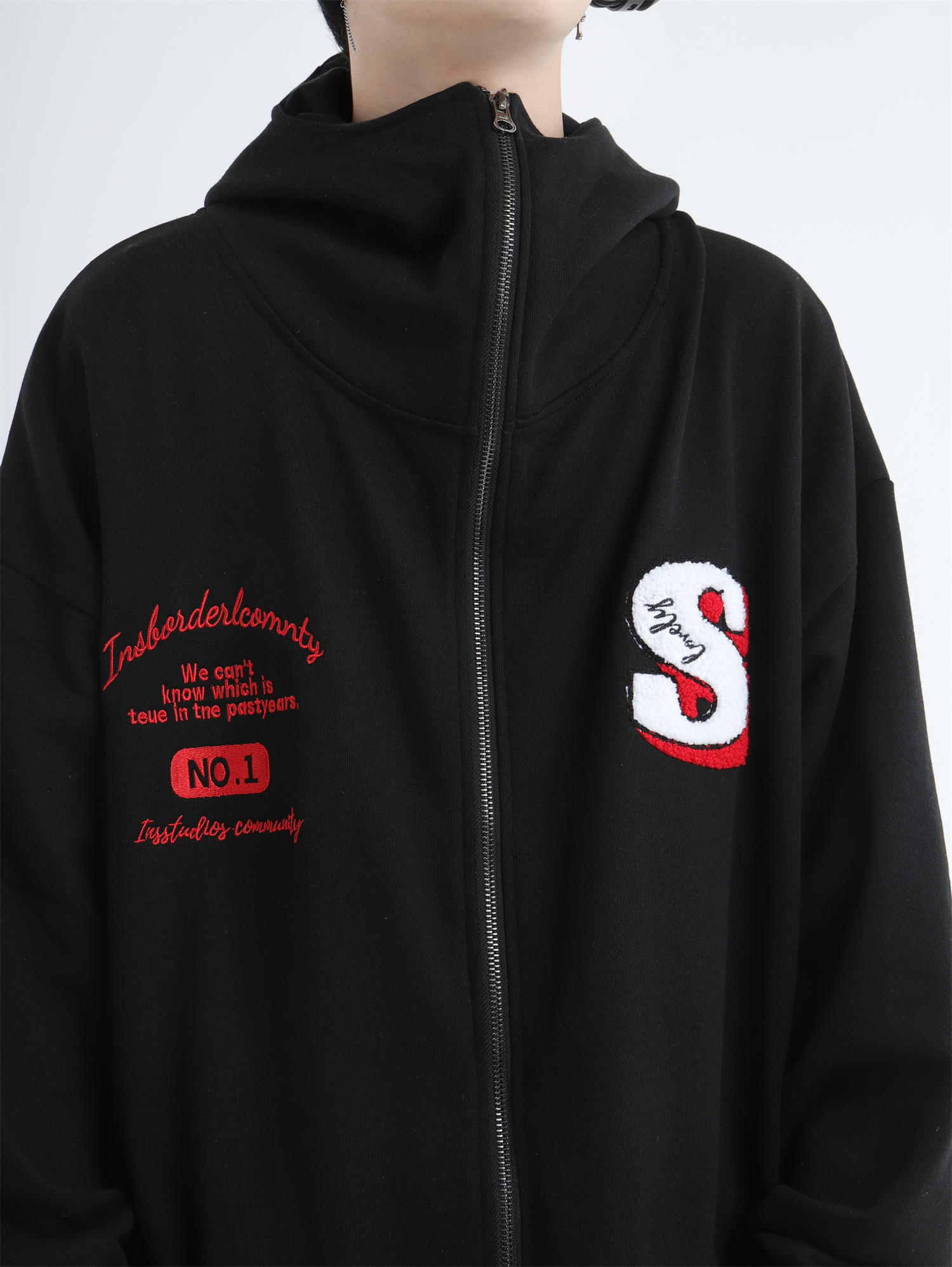 INSstudios 忍者帽植絨開衫厚棉T自制國潮情侶美式寬鬆拉鍊外套男