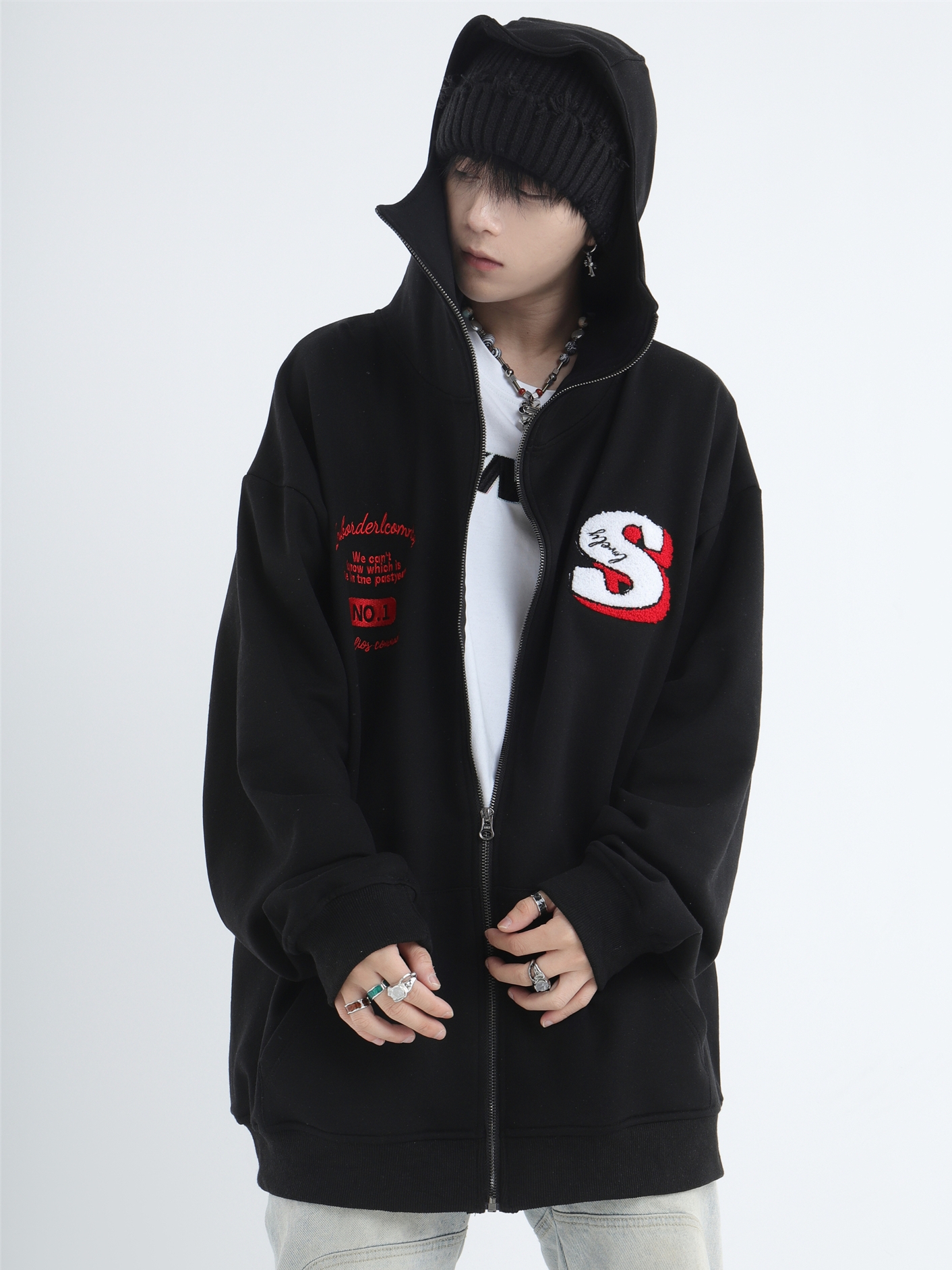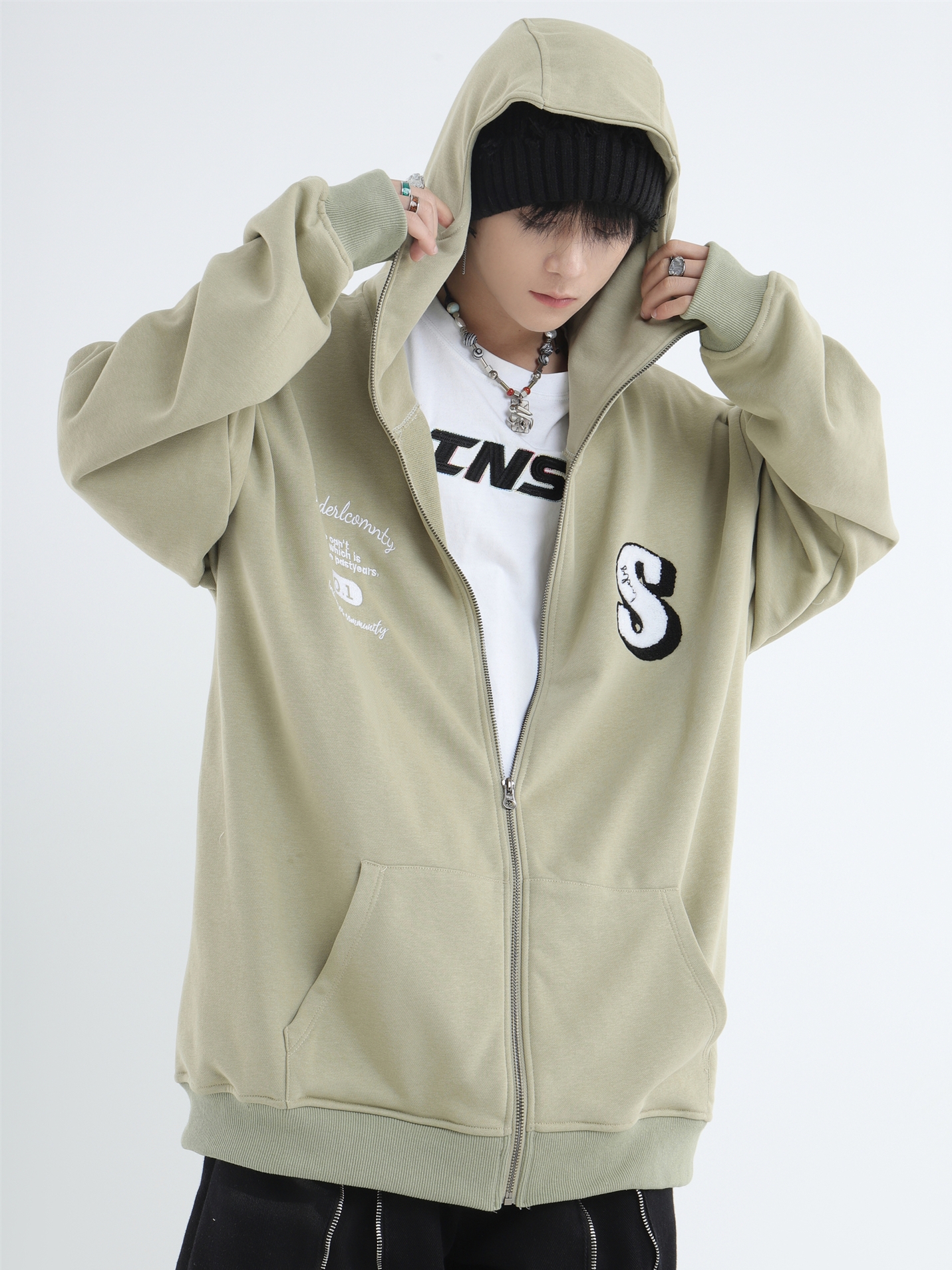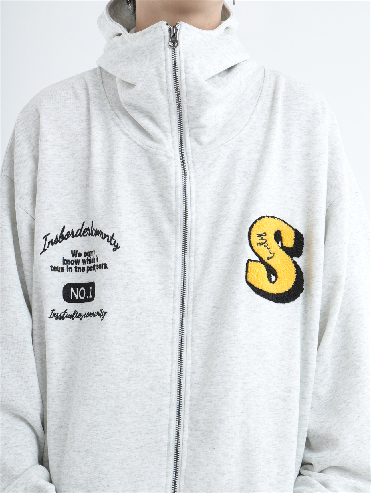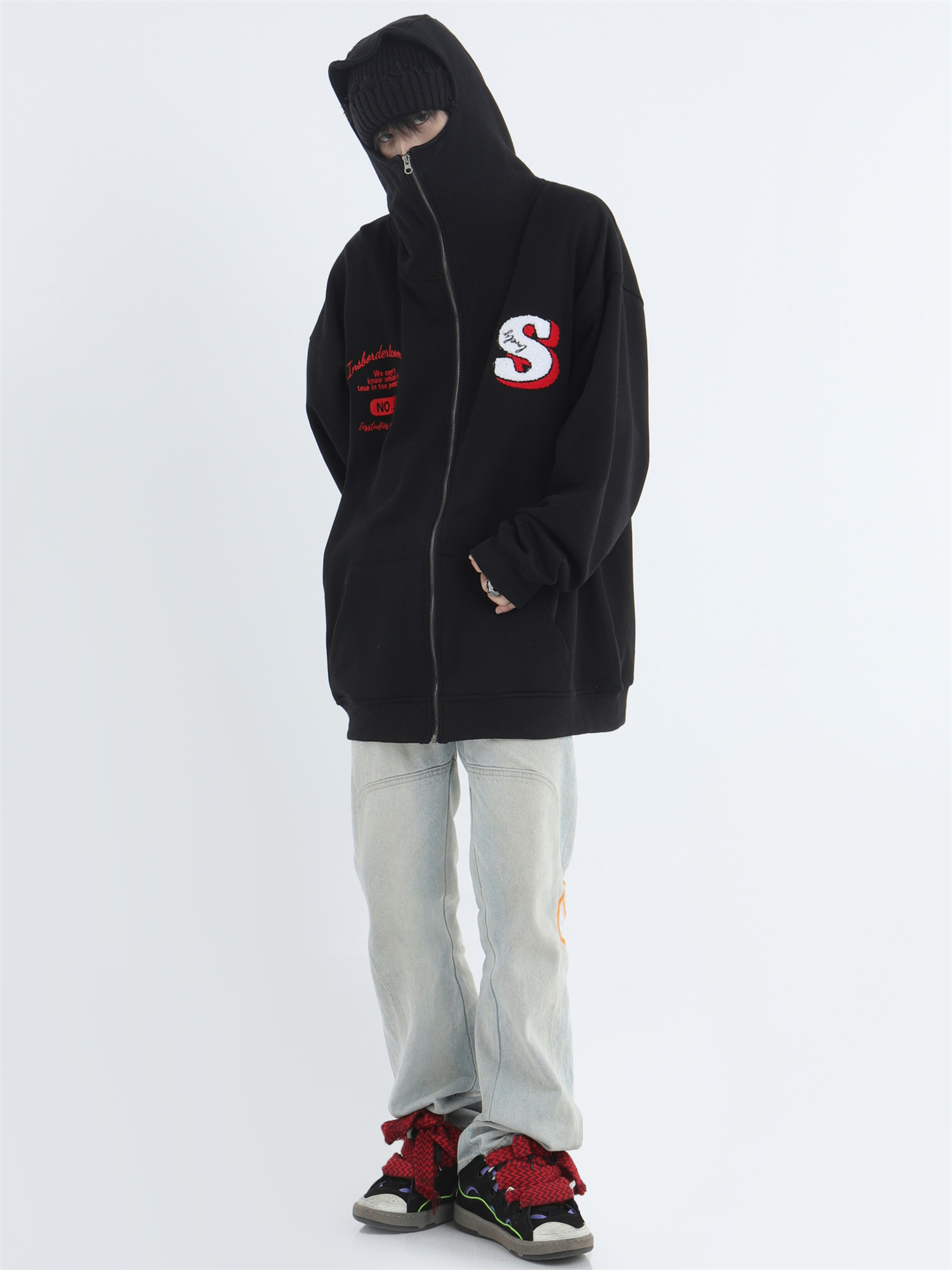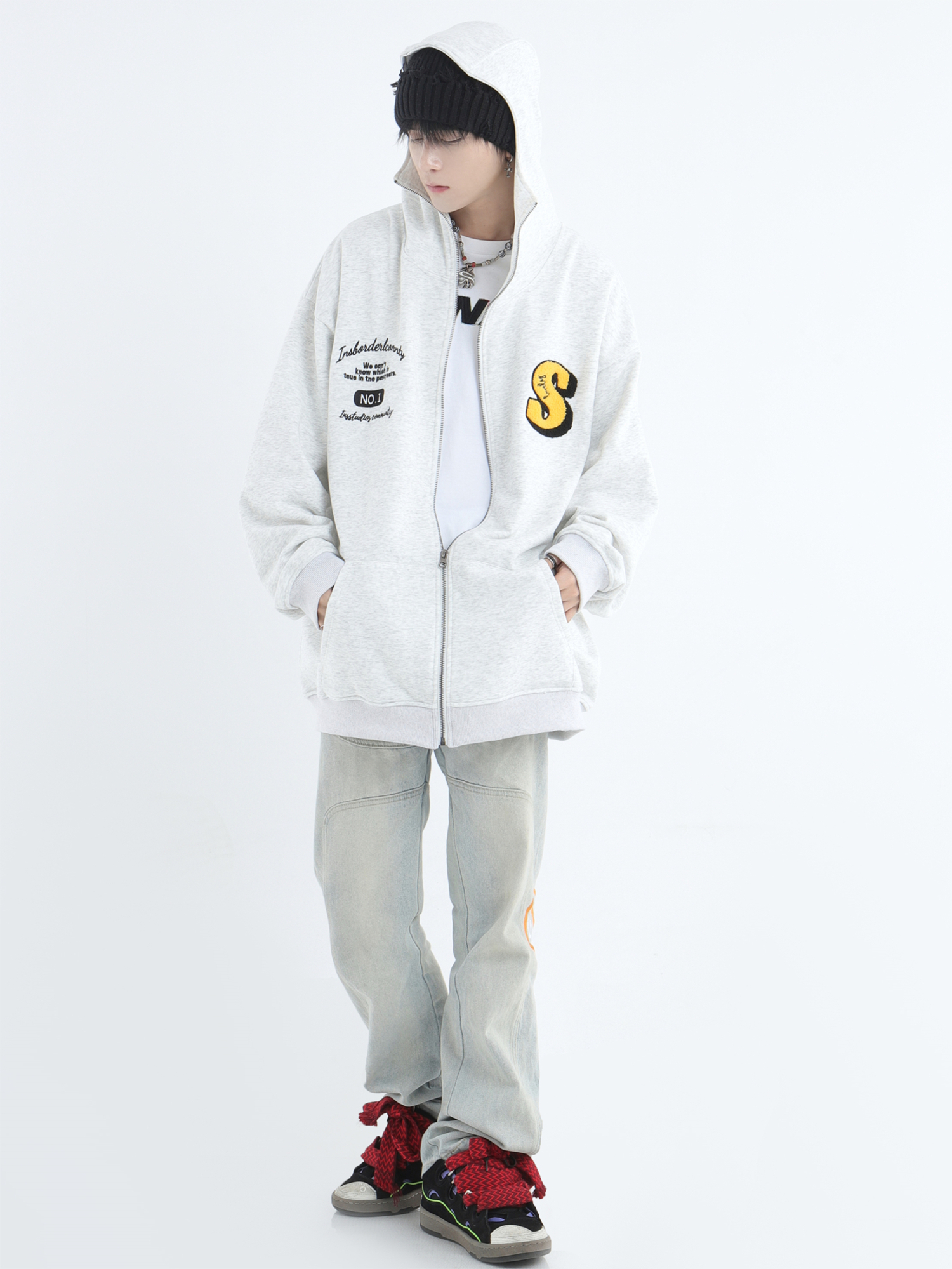 INSstudios 忍者帽植絨開衫厚棉T自制國潮情侶美式寬鬆拉鍊外套男