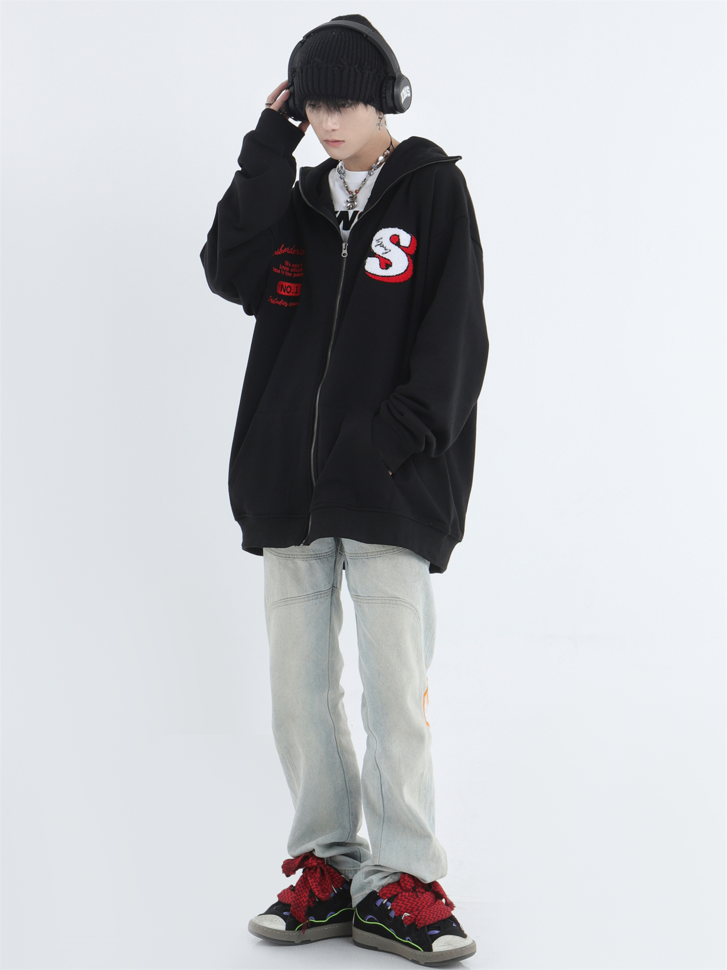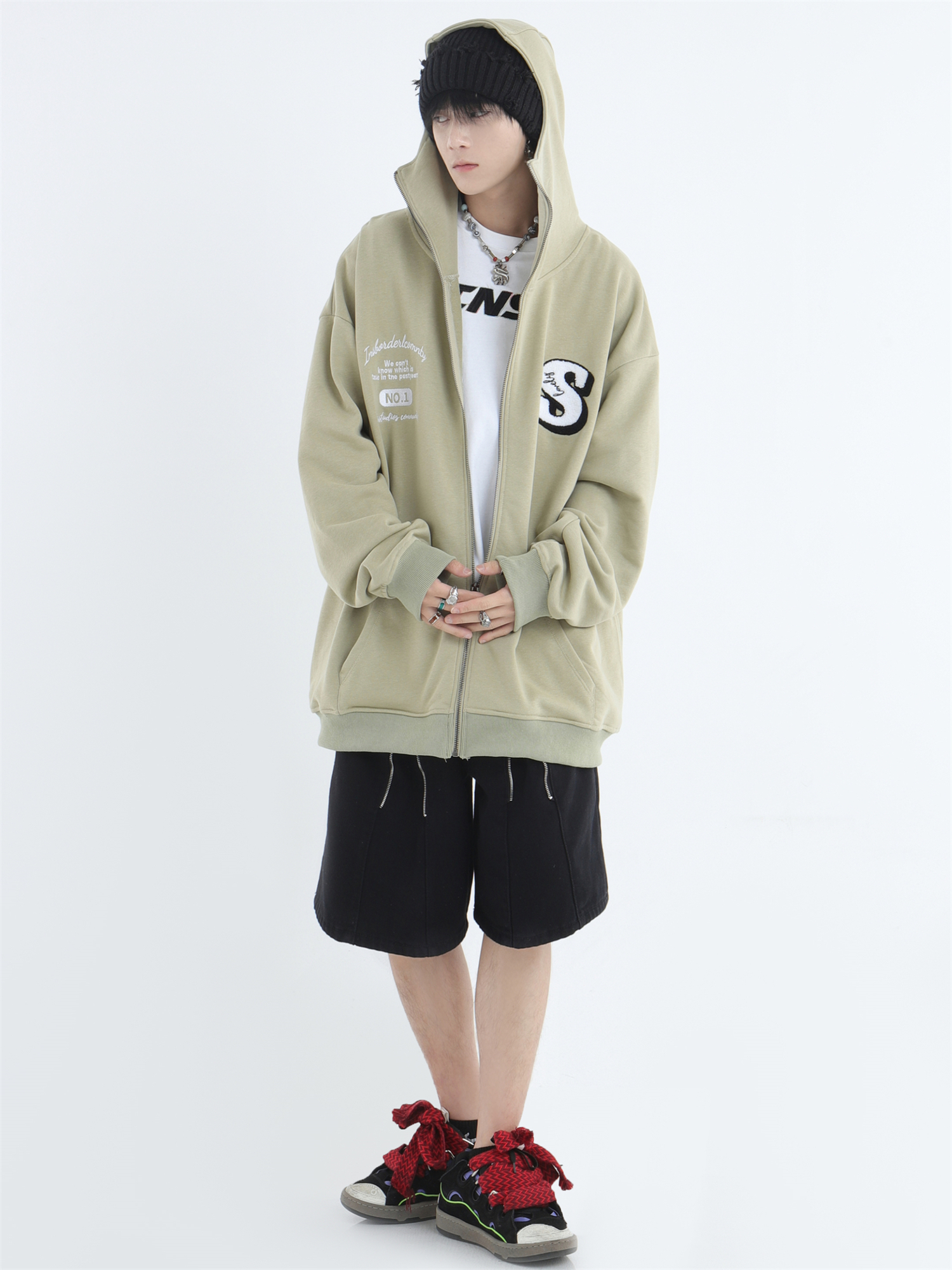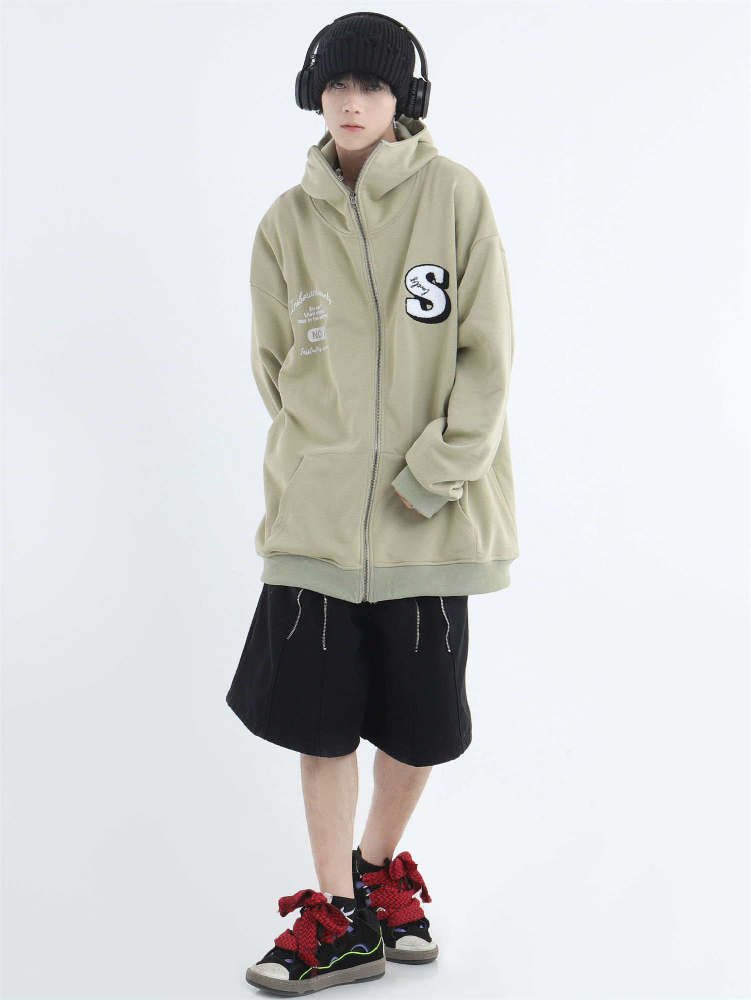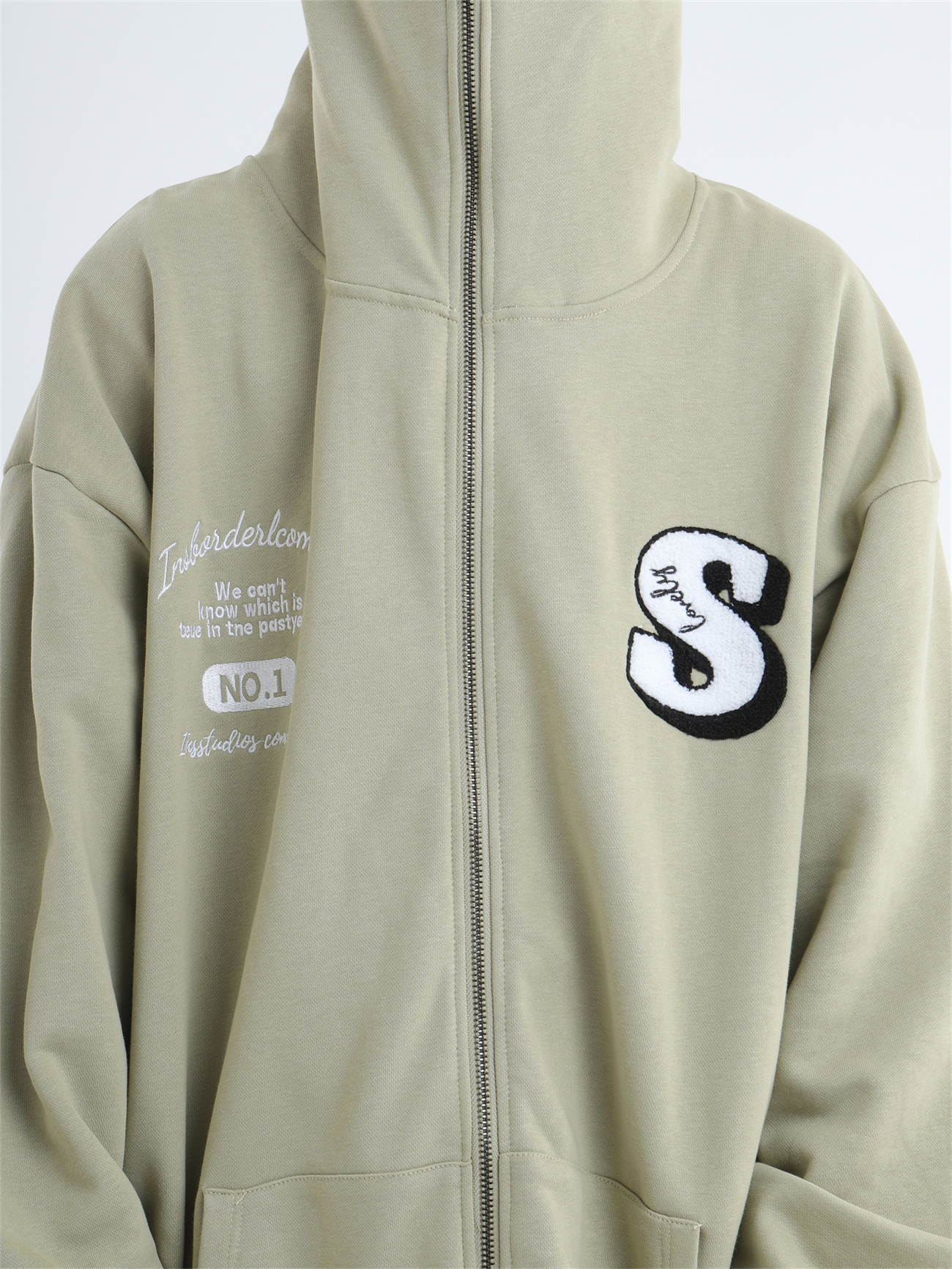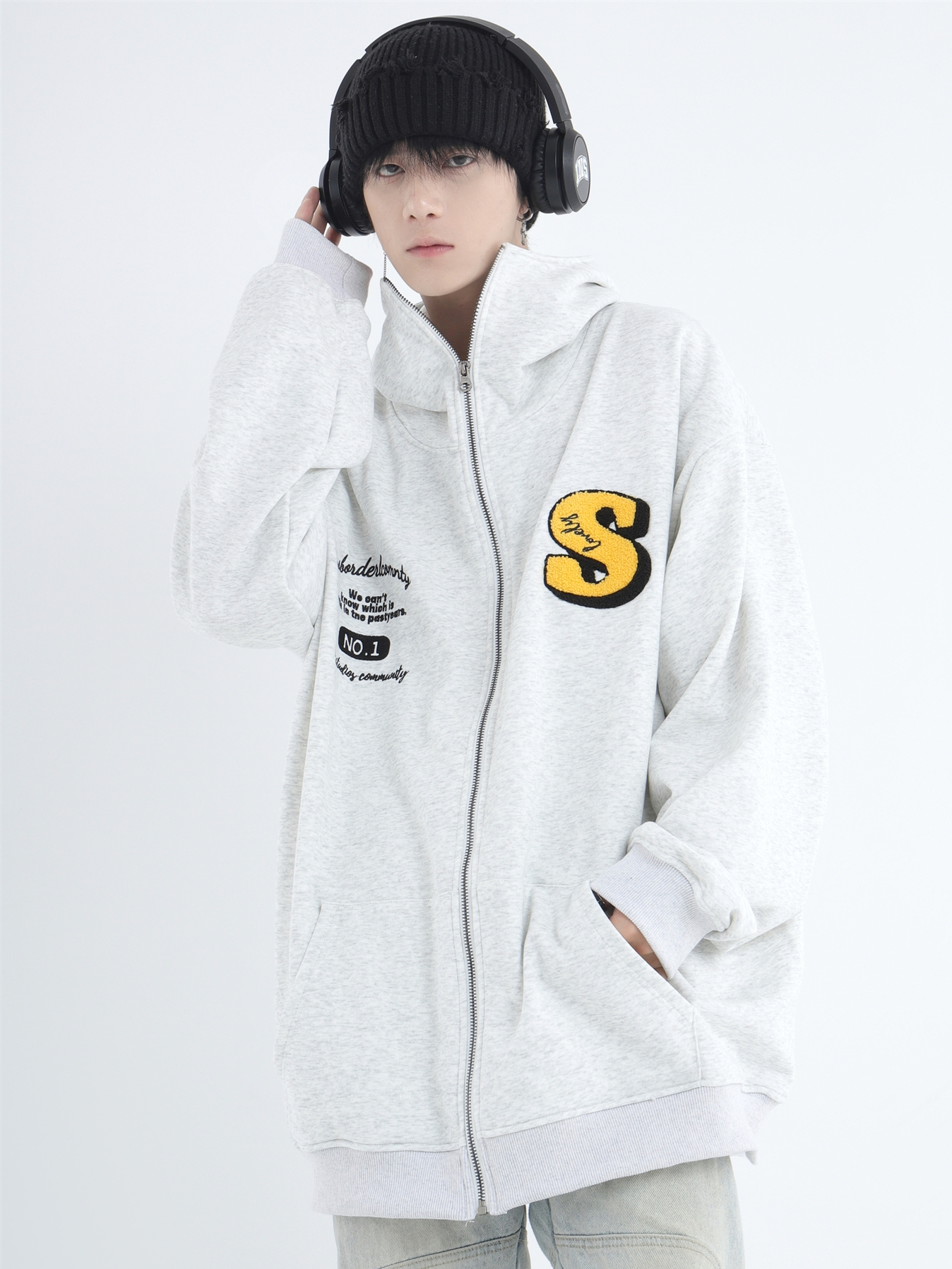 INSstudios 忍者帽植絨開衫厚棉T自制國潮情侶美式寬鬆拉鍊外套男