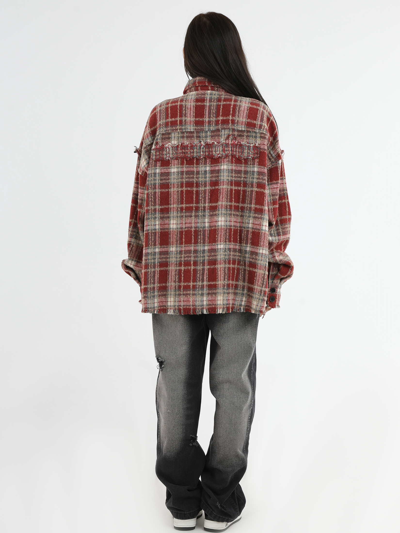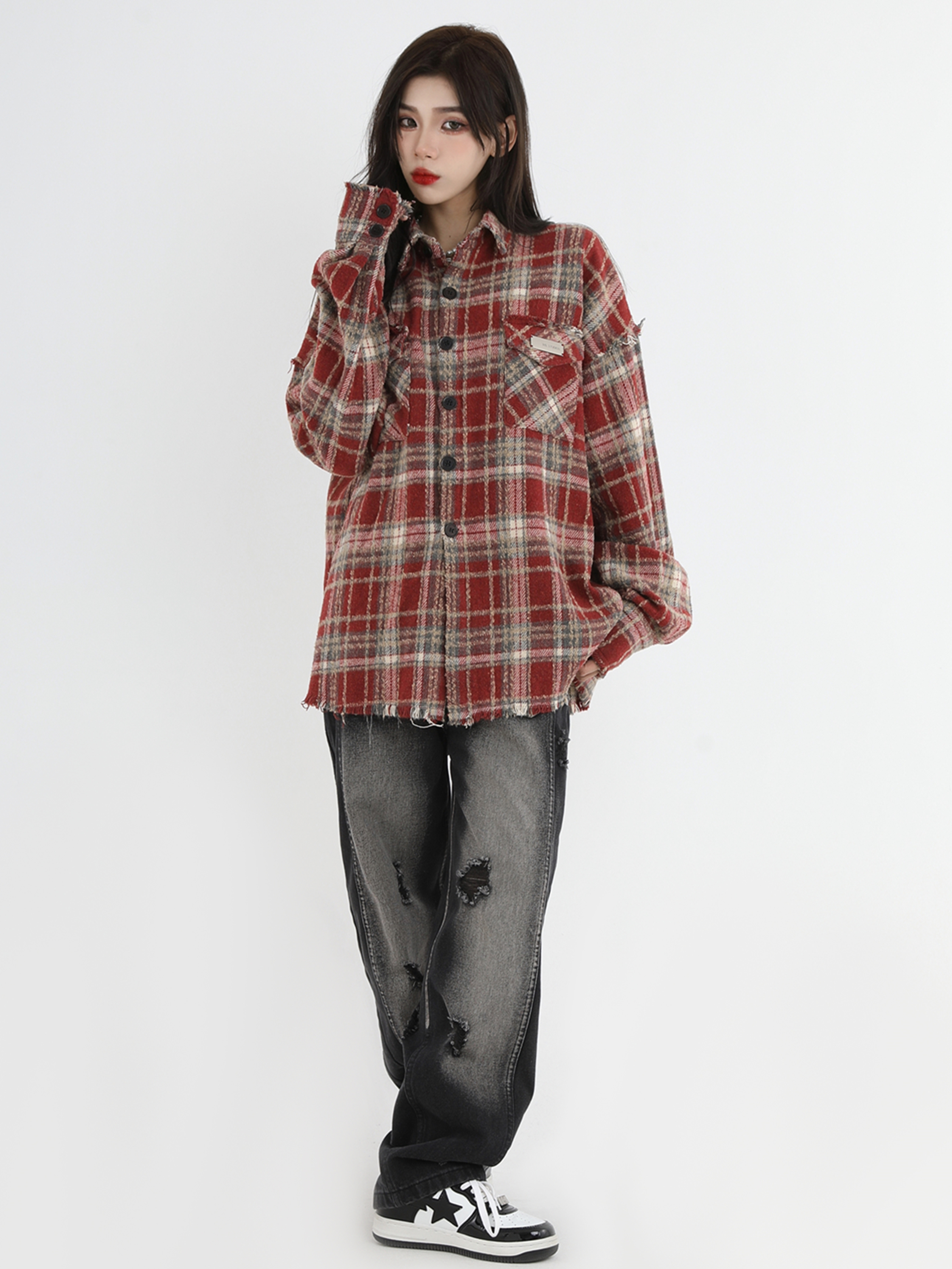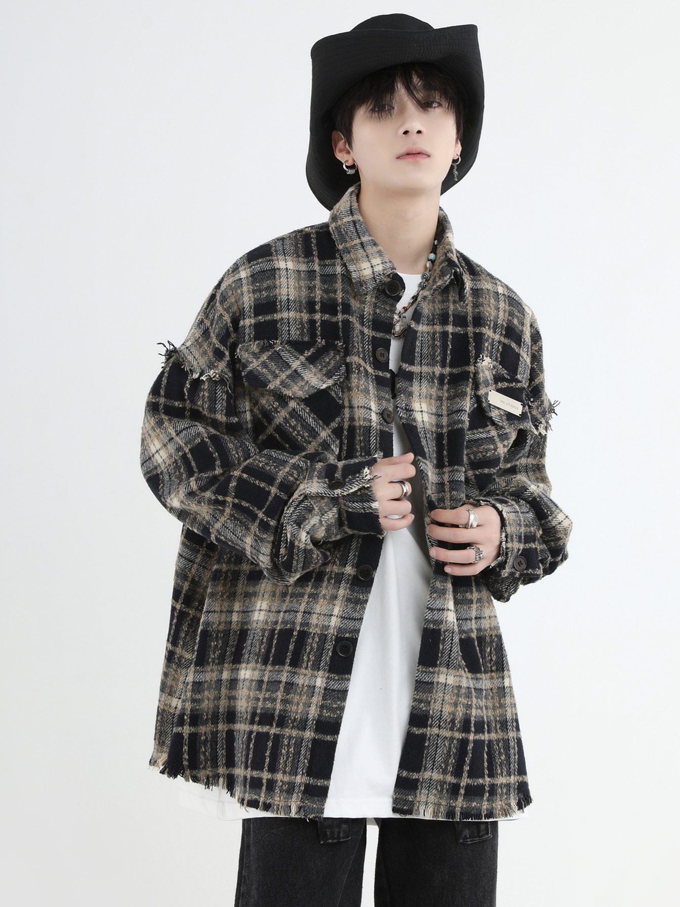 【INSKR】國潮牌情侶美式做舊毛邊布貼繡襯衫外套破壞格紋夾克男