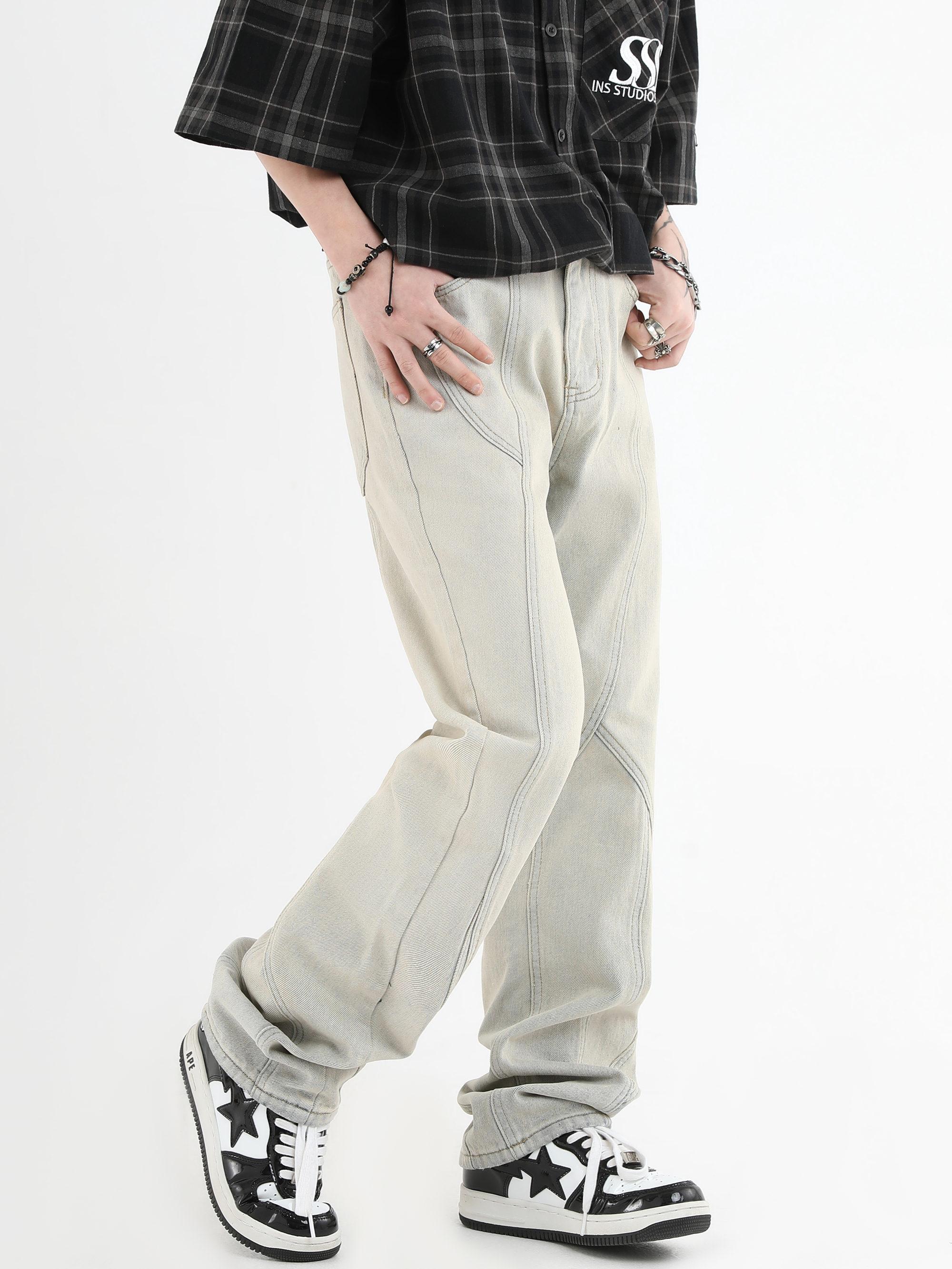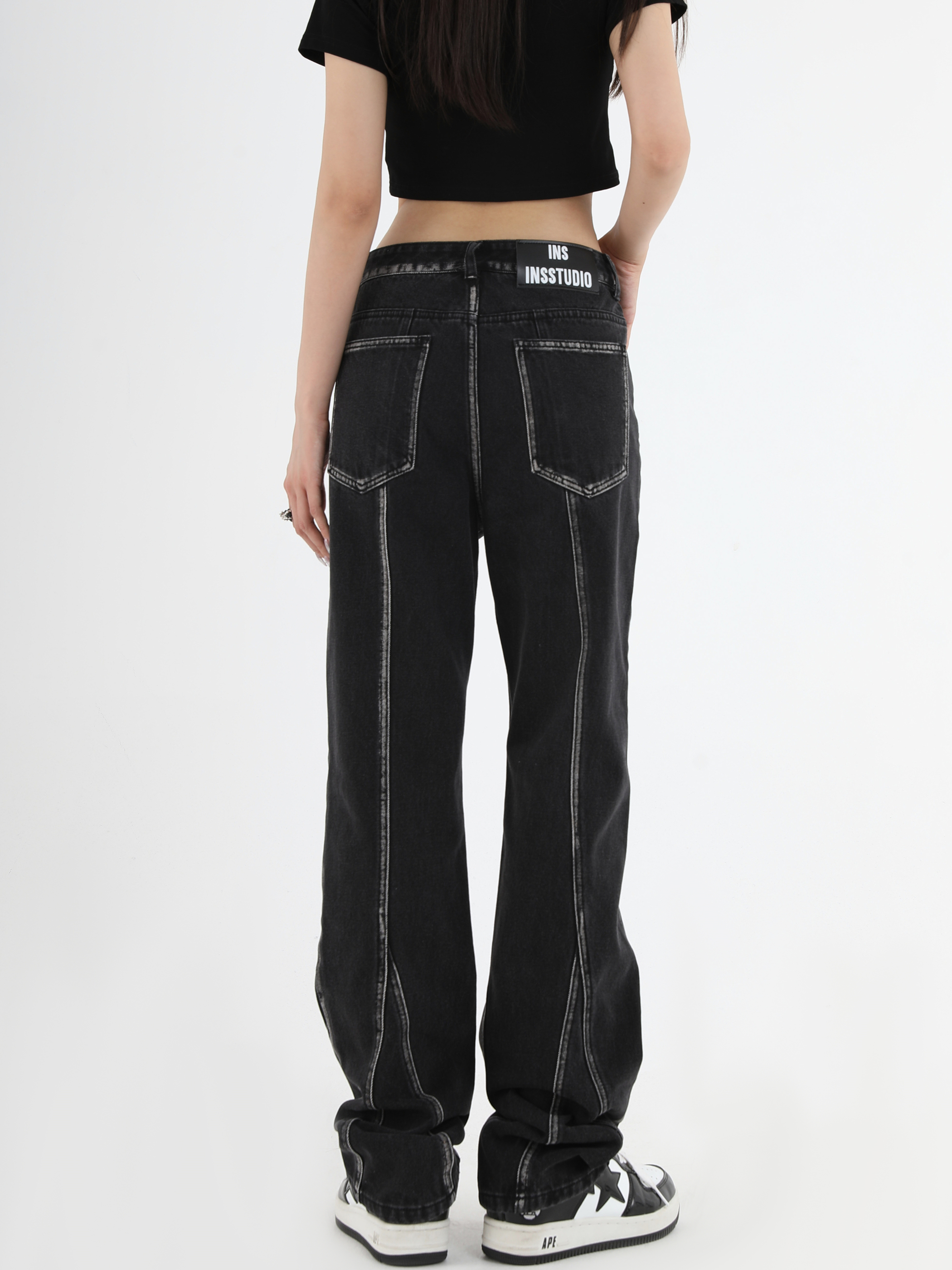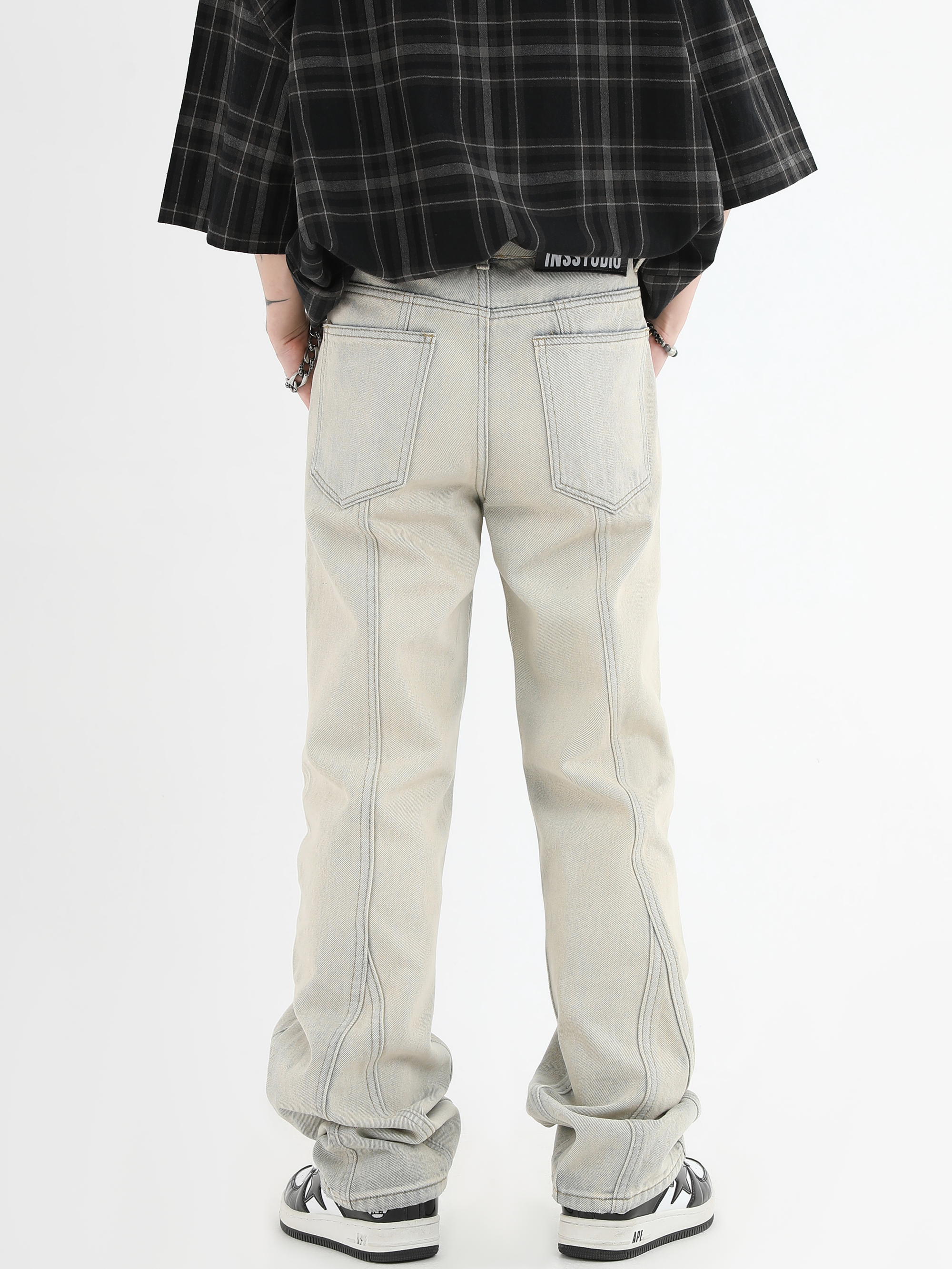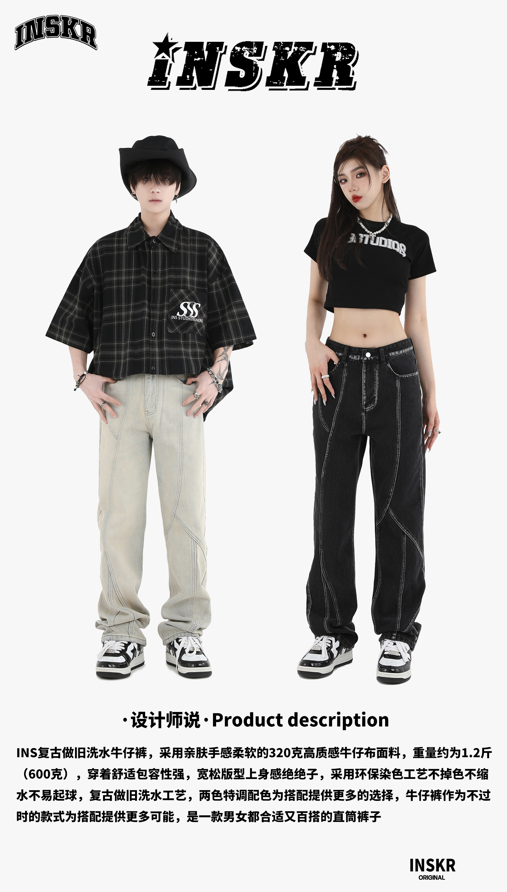 【INSKR】國潮牌情侶美式復古做舊洗水牛仔褲設計感直筒褲子男女
