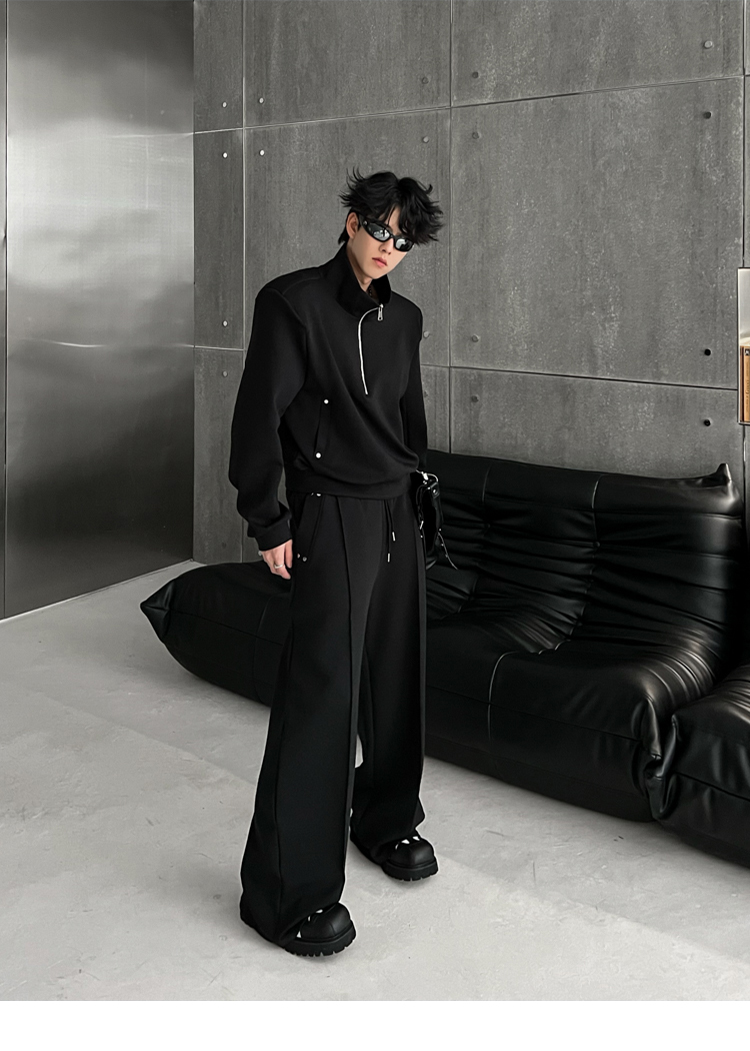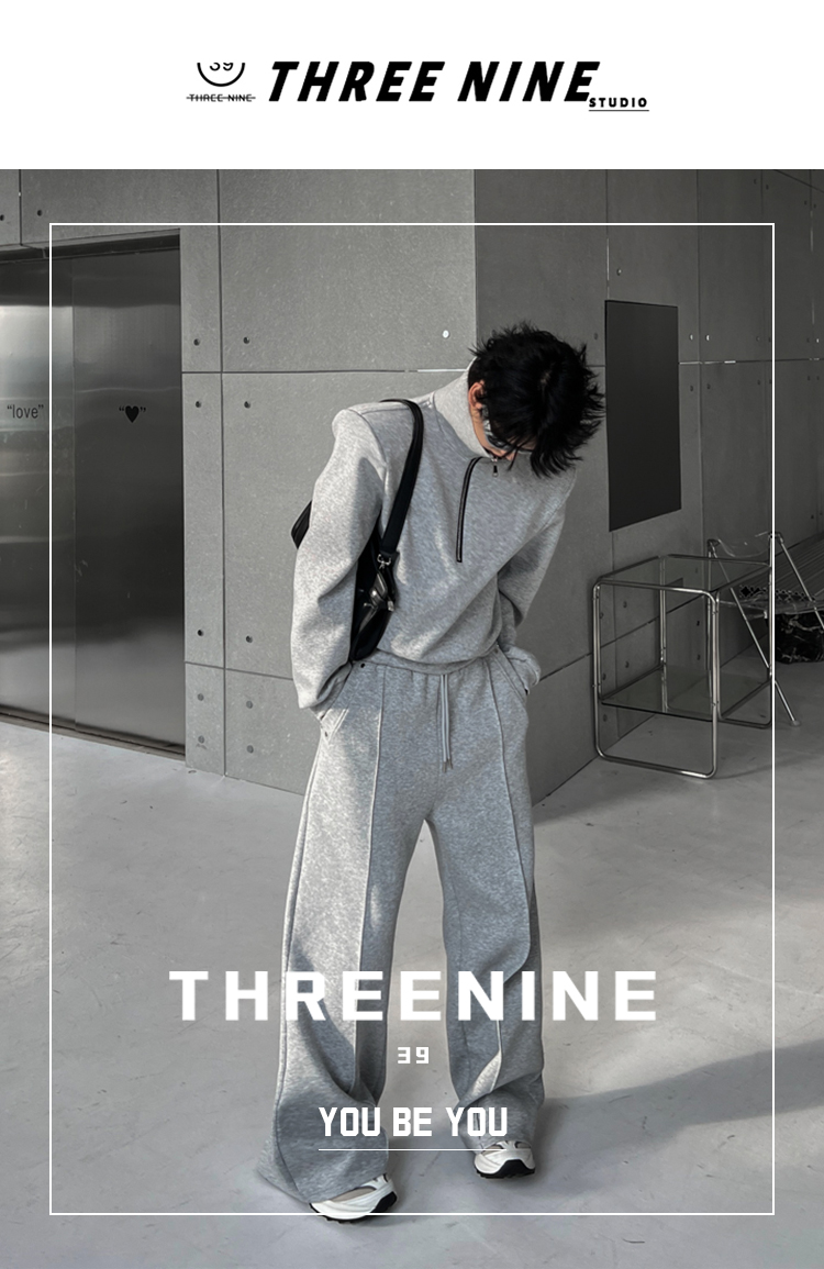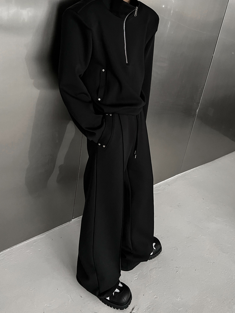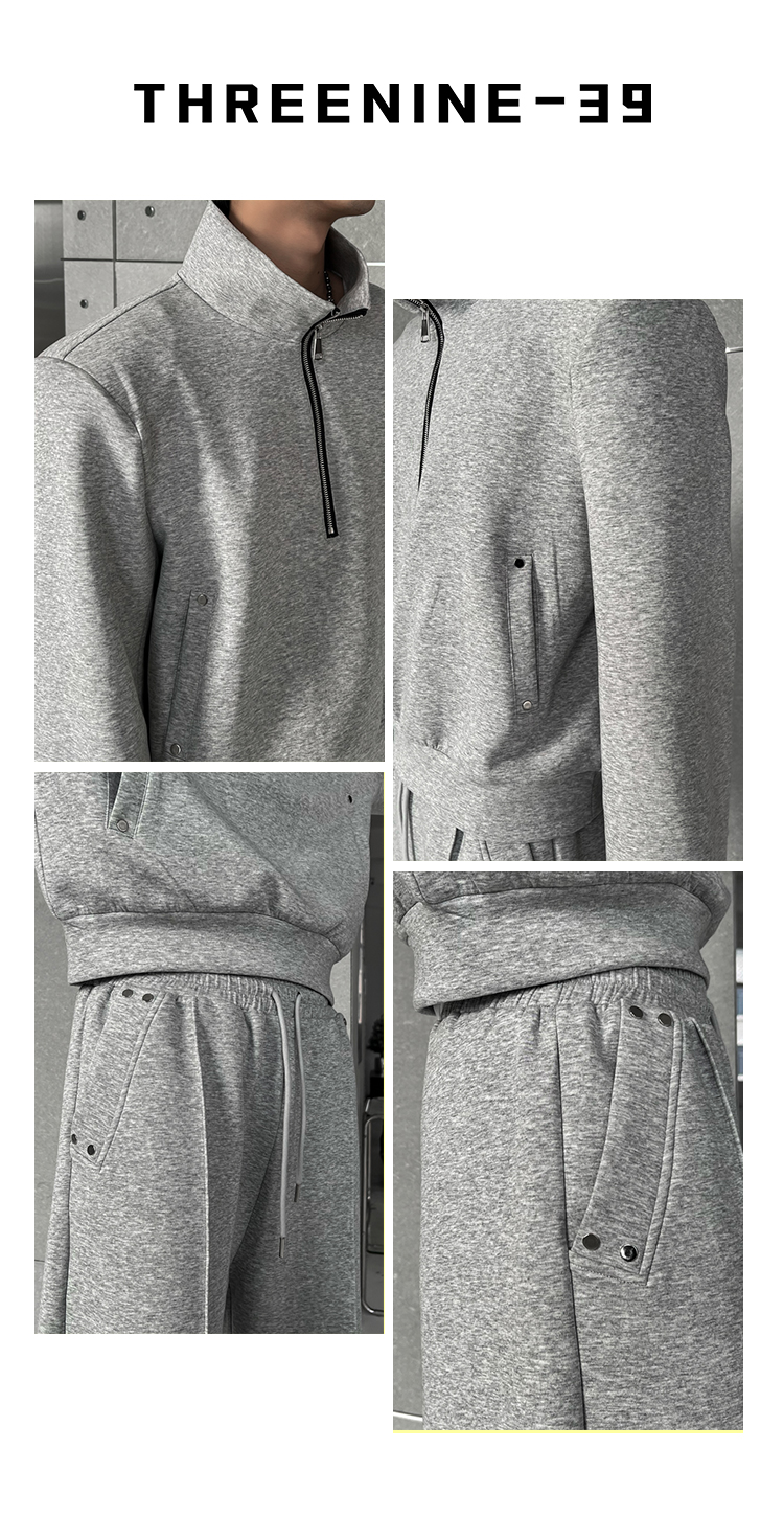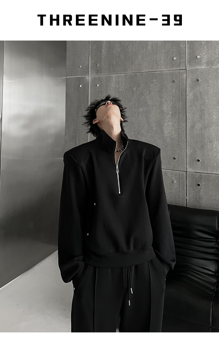 THREENINE 2023SS設計款空氣層立領墊肩短版衛衣套裝休閒厚棉褲男潮